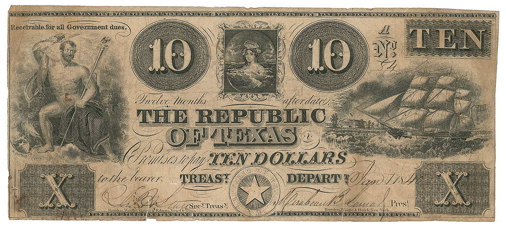 Uncommon Republic of Texas 10 dollar 'redback' note, 7.25 x 3.25, No. 84, dated January 1, 1840, signed along the bottom by James H. Starr and Mirabeau B. Lamar. The note features engraved images of Jupiter holding a lightning bolt to left, a ship under full sail to right, and top center featuring an image of Venus arising from the ocean with oyster shell positioned atop her head. In very good to fine condition, with expected cancellation cuts. The capitol of the Republic of Texas was in Austin from January 19, 1840 to September 1842.
