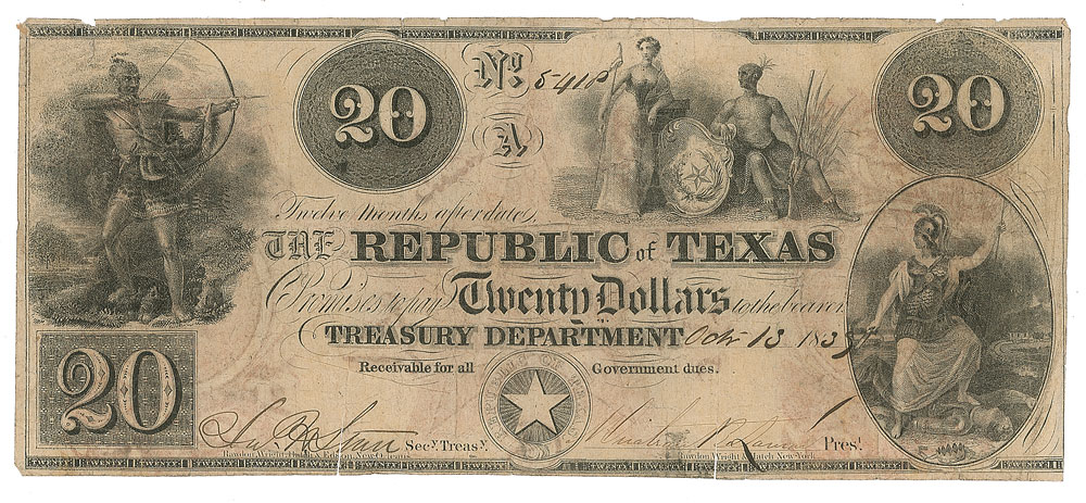 Uncommon Republic of Texas 20 dollar 'redback' note, 7.25 x 3.25, No. 5-41P, dated October 13, 1839, signed along the bottom by James H. Starr and Mirabeau B. Lamar. The note features engraved images of a Native American aiming his bow to left, Columbia and a Native American resting by a shield with emblazoned Lone Star to upper center, and to left a martial Columbia treads on a prostrate figure. In very good to fine condition, with expected cancellation cuts.