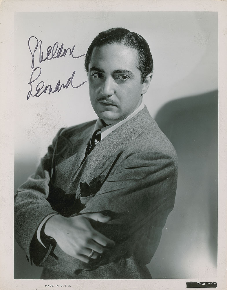 Glossy 8 x 10.25 photo of a young sinister-looking Sheldon Leonard in a shadowy half-length pose, signed in black felt tip. In very good to fine condition, with scattered light creasing. A decidedly early portrait of Leonard taken before his tenure as a successful television producer.