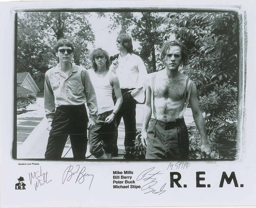 Glossy 10 x 8 I.R.S. publicity photo of the band, signed in black ballpoint by Mike Mills, Bill Berry, Peter Buck, and Michael Stipe. In very good to fine condition, with repaired tear to the upper left, and a light scratch across the image.