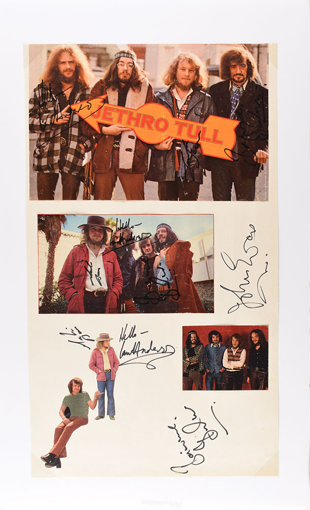 Large off-white 11.25 x 19.5 scrapbook page bearing affixed images of Jethro Tull, signed in black felt tip by John Evan, and three times each by Martin Barre, Barriemore Barlow, and Ian Anderson, who adds "Hello" to each of his signatures. Removably corner-mounted to a slightly larger piece of foamcore. In fine condition, with some wrinkling and handling wear. Consignor notes that these vintage signatures were obtained in person in Vienna during the early to mid-1970s.
