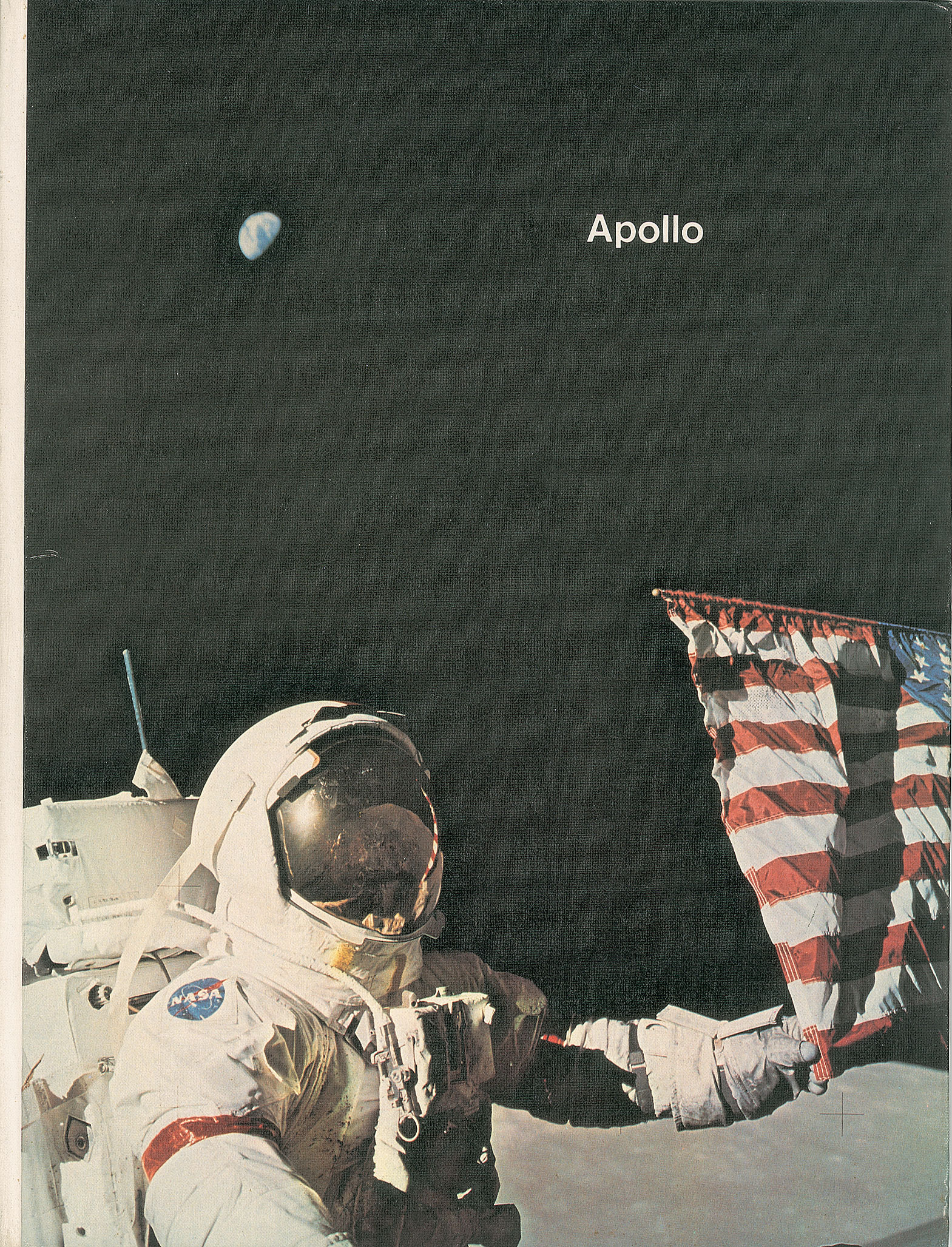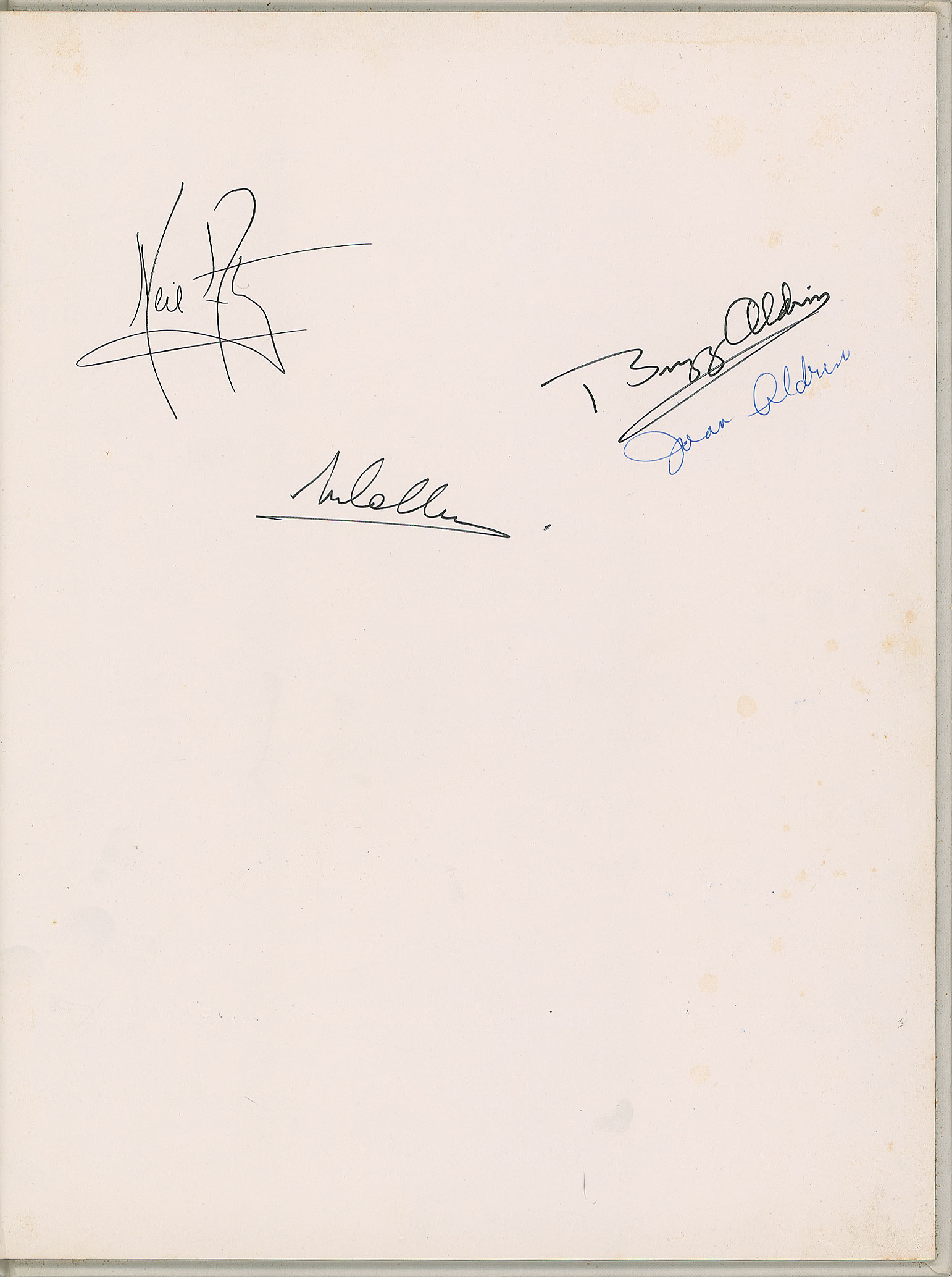 Signed book: Apollo. Washington, D.C.: NASA, 1973. Hardcover, 10.75 x 14.25, 65 pages. Signed on the first free end page in black ink by Apollo 11 crew members Neil Armstrong, Michael Collins, and Buzz Aldrin, whose wife Joan signs below. The adjacent inside cover is signed in ink or ballpoint by the crews of Apollo 8 and 13—James Lovell, Frank Borman, Bill Anders, Jack Swigert, and Fred Haise—in addition to many NASA administrators, flight directors, and their wives, including: James Fletcher, Gerry Griffin, Tom and Barbara Paine, George and Mary Low, Dale and Marge Myers, Valerie Anders, Willis and Virginia Shapley, Rocco and Ruth Petrone, Robert and Gene Seamans, Paul and Florence Dembling, George and Ellen Chandler, Gerald and Helen Truszynski, George Mueller, and one other. In fine condition. An impressive assortment of 32 signatures that features a cast of eight Apollo astronauts and a bevy of behind-the-scenes figures essential to the well-oiled efficiency of the historic Apollo program.