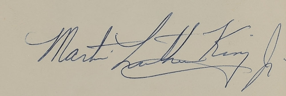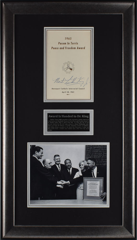 Magnificent program for the 1965 Pacem In Terris Peace and Freedom Award ceremony in Davenport, Iowa, on April 28, 1965, 5.25 x 8.5, signed prominently on the front cover in crisp black ballpoint by Martin Luther King, Jr. Handsomely double-matted and framed with a plaque and photo of King receiving the award to an overall size of 17 x 29.5. In very fine condition. King was one of four individuals honored with the Pacem in Terris (Peace and Freedom) award at an event organized by the Davenport Catholic Interracial Council at the local Masonic Temple. After accepting the award, King delivered a resounding speech to the crowd of nearly 800 attendees, calling for the end of segregation, social action, and civil rights legislation. His words from that night, in part: 'To make justice a reality, we must develop massive action programs. With a strong action program—picketing when necessary, demonstrating when necessary, marching when necessary—all undergirded with the philosophy of non-violence we can bring the American dream into full reality.'