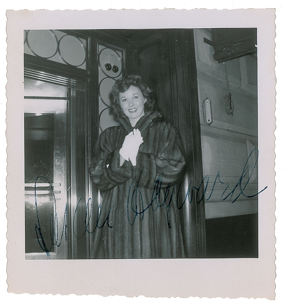 Vintage glossy 3.5 x 3.5 candid photo of Susan Hayward posing outside and wearing a fur coat, signed in fountain pen by the Oscar-winning actress. In fine condition, with moderate signature contrast. Originally obtained in person by a New York autograph collector who collected from the 1950s through the 2000s.
