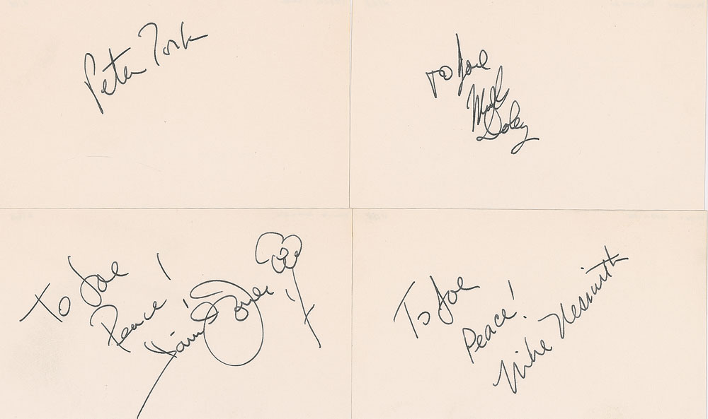 Crisp vintage fountain pen signatures from The Monkees on individual off-white 5 x 3 cards, including: "To Joe, Peace! Mike Nesmith," "To Joe, Mickey Dolenz," "To Joe, Peace! David Jones [with a flower sketch]," and "Peter Tork." Notations on the reverse date the signatures to 1968. In overall very fine condition. Originally obtained in person by a New York autograph collector who collected from the 1950s through the 2000s.