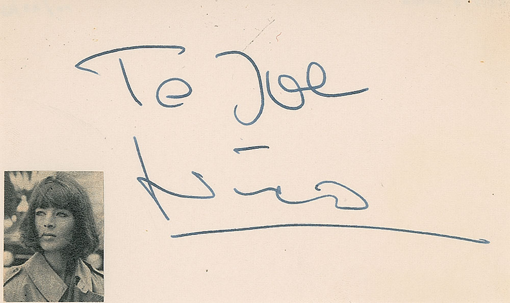 Rare vintage fountain pen signature and inscription, "To Joe, Nico,” on an off-white 5 x 3 card bearing a small affixed portrait. Notation on the reverse dates the signature to October 23, 1963. In very fine condition. Originally obtained in person by a New York autograph collector who collected from the 1950s through the 2000s, this is the first Nico autograph we have ever offered.