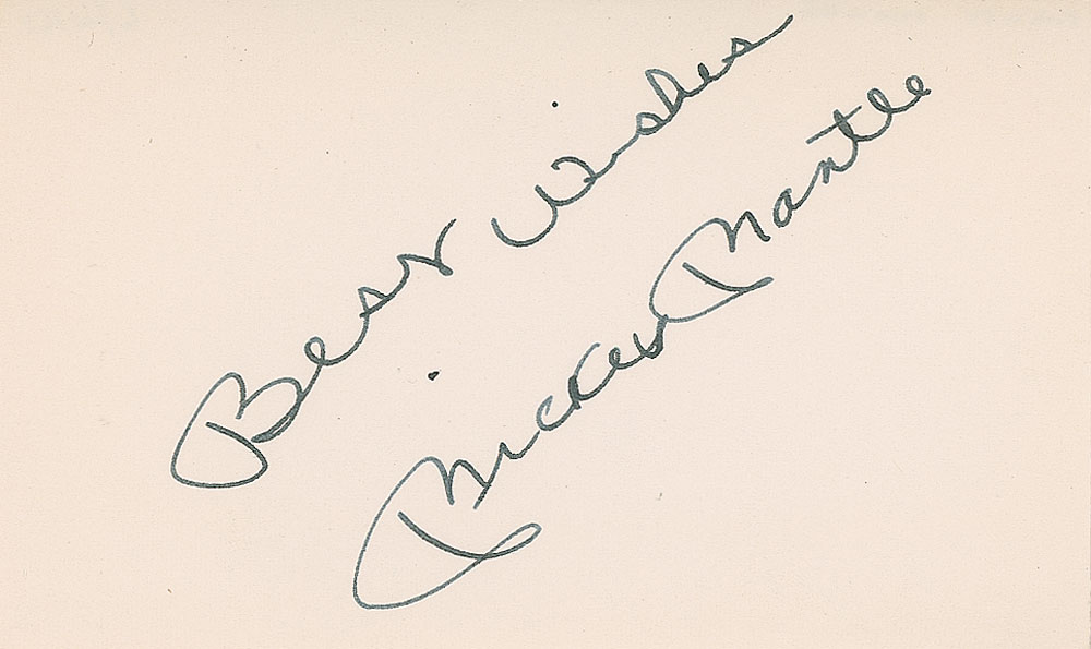 Bold vintage fountain pen signature, "Best Wishes, Mickey Mantle,” on an off-white 5 x 3 card. Notation on the reverse dates the signature to June 21, 1967. In very fine condition. Originally obtained in person by a New York autograph collector who collected from the 1950s through the 2000s.