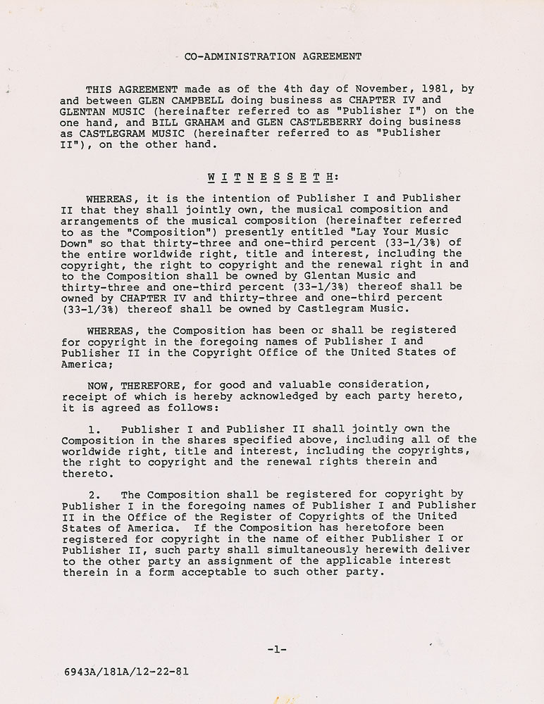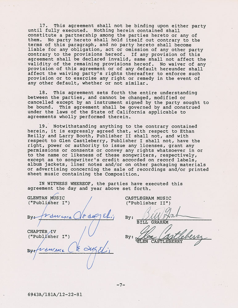 DS, seven pages, 8.5 x 11, November 4, 1981. Co-administration agreement made between Glen Campbell, Bill Graham, and Glen Castleberry, regarding the publishing rights to the "musical composition and arrangements?presently entitled 'Lay Your Music Down.'" Signed at the conclusion by Bill Graham and Glen Castleberry, and countersigned twice by a publisher. In fine condition, with staple holes to the top edge.