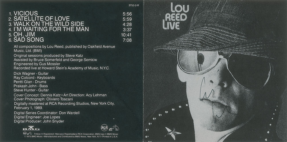 Lou Reed Live CD booklet, signed on the front in black ink by the Velvet Underground frontman. In fine condition, with a light diagonal bend. The CD is not included.