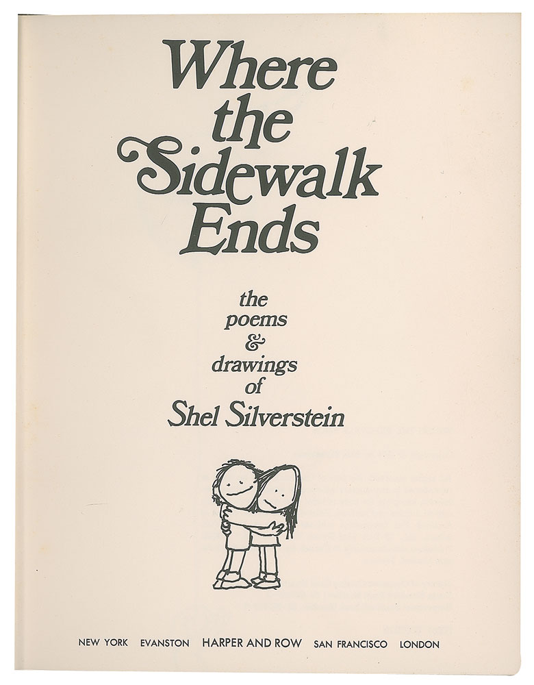 Desirable unsigned true first edition book: Where the Sidewalk Ends by Shel Silverstein. First edition (stated on copyright page). NY: Harper & Row, 1974. Hardcover with dust jacket (retaining the correct "$7.95" price, but with the bottom corner of the front flap clipped), 7 x 9, 166 pages. Book condition: VG/VG, with a small ownership inscription to first free end page and light sunning to the dust jacket.