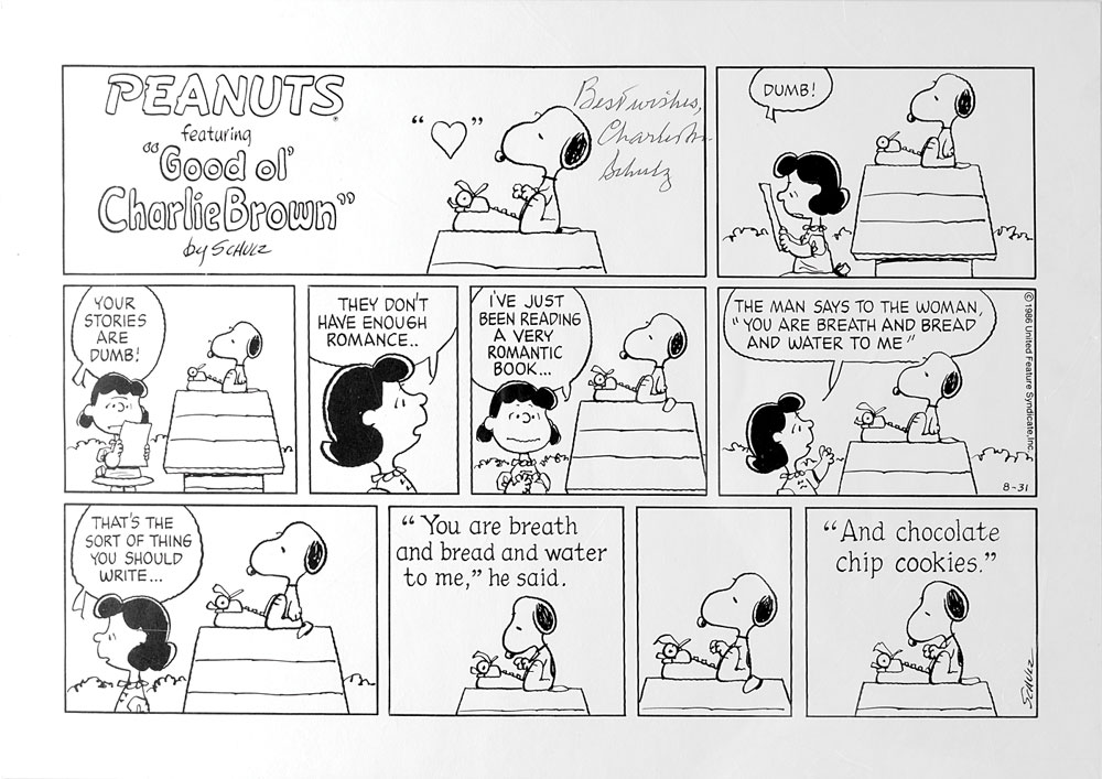 Handsome print of a 1986 Peanuts strip by Charles Schulz, 24 x 17, nicely signed in the first panel in blue ballpoint, "Best wishes, Charles M. Schulz." The strip portrays Snoopy as a writer, with Lucy making suggestions for his work—'They don't have enough romance. I've just been reading a very romantic book…The man says to the woman, 'You are breath and bread and water to me.' That's the sort of thing you should write.' The comic closes with Snoopy typing, ''You are breath and bread and water to me,' he said. 'And chocolate chip cookies.'' In fine condition. A desirable print of a humorous Peanuts strip, signed by the renowned cartoonist.