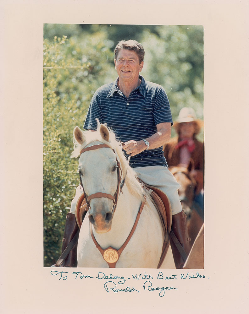 Color satin-finish 8 x 10 photo of Reagan riding his horse 'El Alamein' at Rancho del Cielo, signed and inscribed in thin black felt tip, "To Tom Delong—with best wishes, Ronald Reagan.” In fine condition.