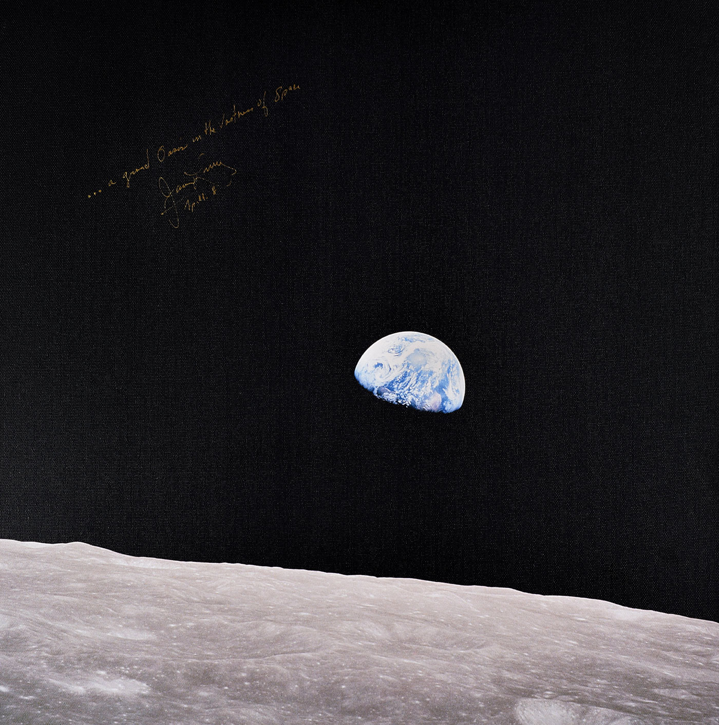 Outstanding color 20 x 20 print on canvas of the Apollo 8 'Earthrise,' signed by the mission's Command Module Pilot in gold ink, "?a grand Oasis in the Vastness of Space, James Lovell, Apollo 8." In very fine condition, with some light skipping to the signature.