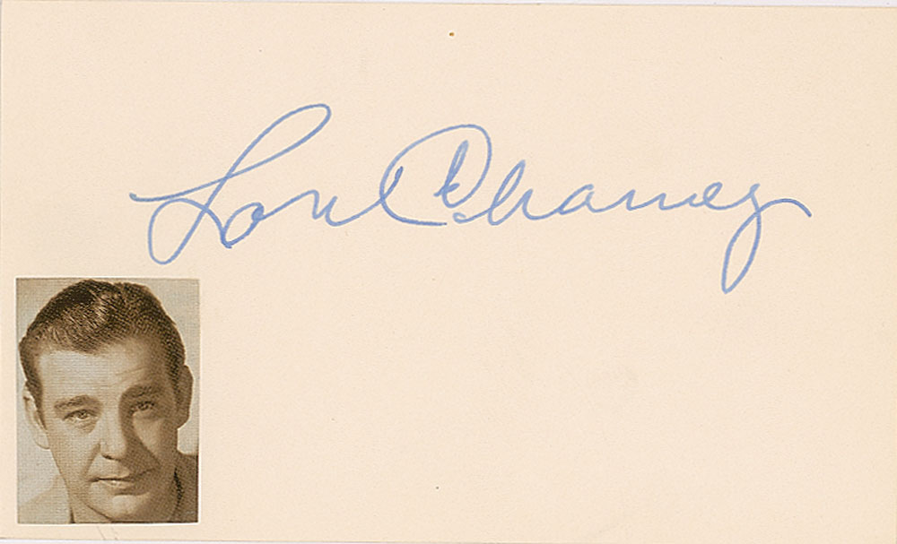 Choice fountain pen signature, "Lon Chaney,” on an off-white 5 x 3 card bearing a small affixed portrait. In very fine condition. Originally obtained in person by a New York autograph collector who collected from the 1950s through the 2000s.