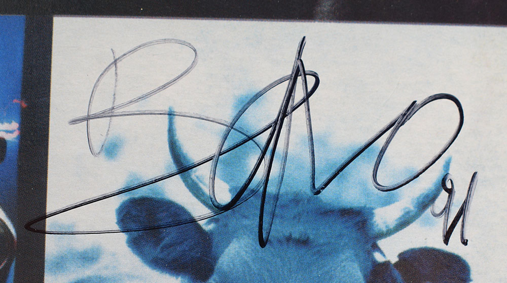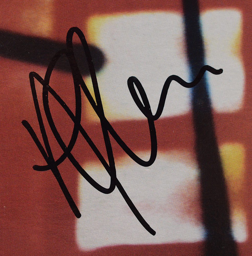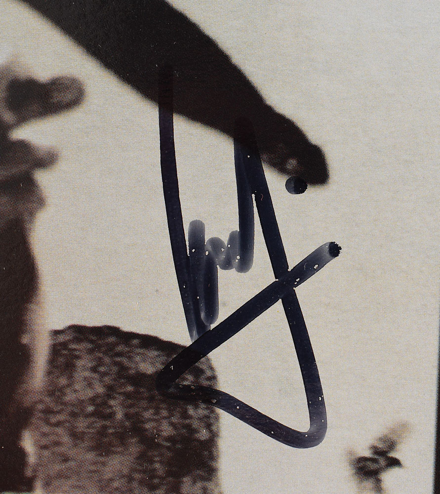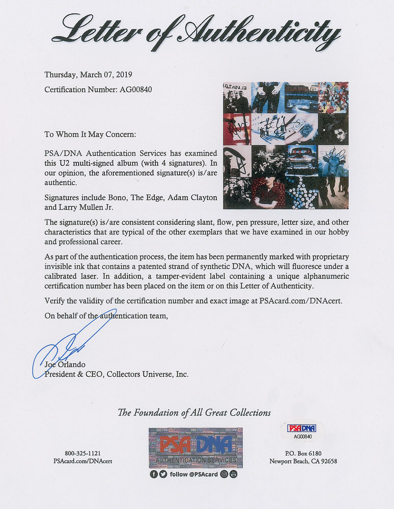 Achtung Baby album by U2, signed on the front cover in black felt tip, "Bono, 91," "Edge," "Adam," and "Larry." In fine condition, with a square piece of mat affixed to the back cover from being displayed. The record is not included. Accompanied by a full letter of authenticity from PSA/DNA.