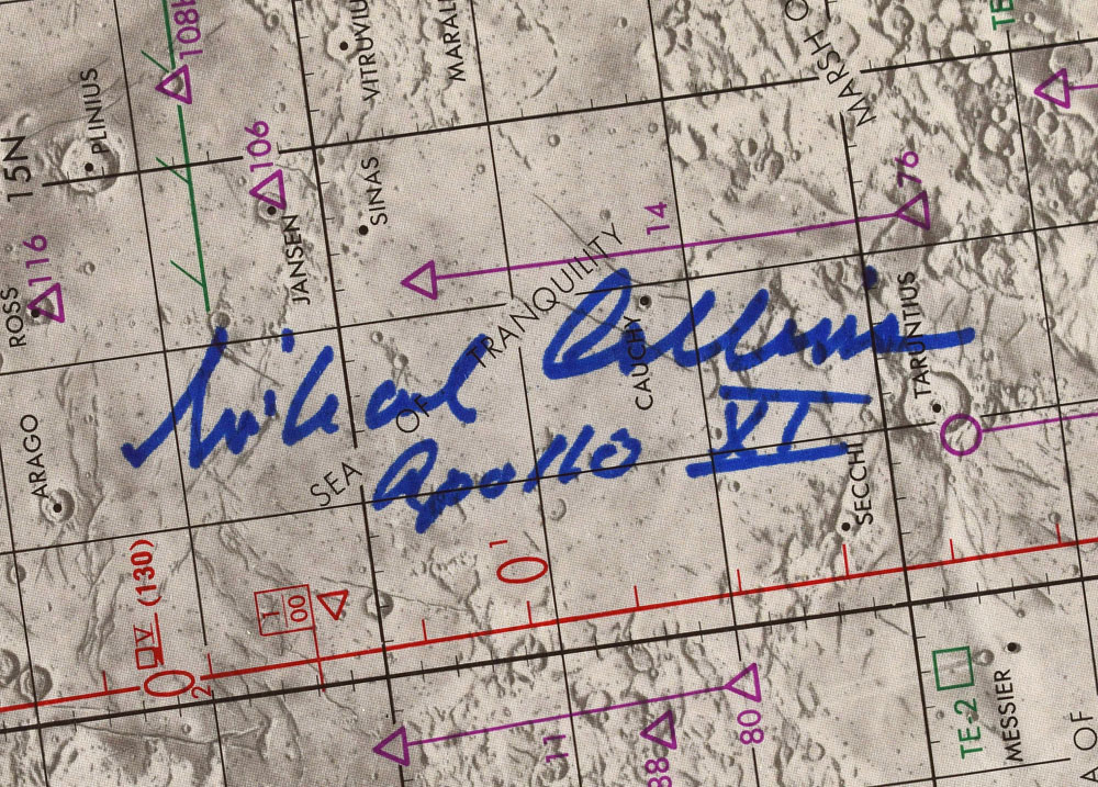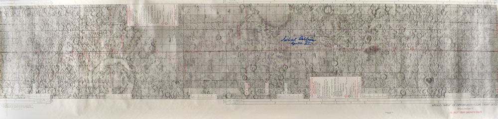 Color second edition of the Apollo 11 Target of Opportunity Flight Chart, 58.25 x 14, issued as SKB 32100097-301, dated June 26, 1969, signed in blue felt tip, "Michael Collins, Apollo XI." Lithographed by ACIC 7-69, and prepared under the direction of the Department of Defense by the Aeronautical Chart and Information Center. Rolled and in fine condition.