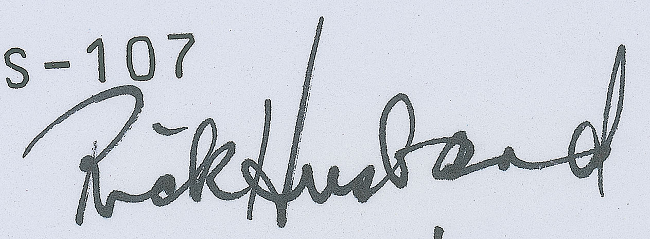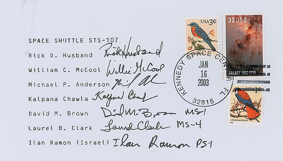 Sought-after postal cover, 6.5 x 3.75, postmarked at Kennedy Space Center on January 16, 2003, the launch date of the tragic STS-107 mission, signed by the crew next to their respective typed name in black ink, "Rick Husband," "Willie McCool, "Michael Anderson," "Kalpana Chawla," "David M. Brown, MS-1," "Laurel Clark, MS-4," and "Ilan Ramon, PS-1." In fine condition, with a faint paperclip impression to the top edge. Fully signed examples of the STS-107 crew are scarce and widely coveted across all formats—by all accounts, a clean and highly presentable cover.