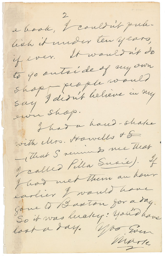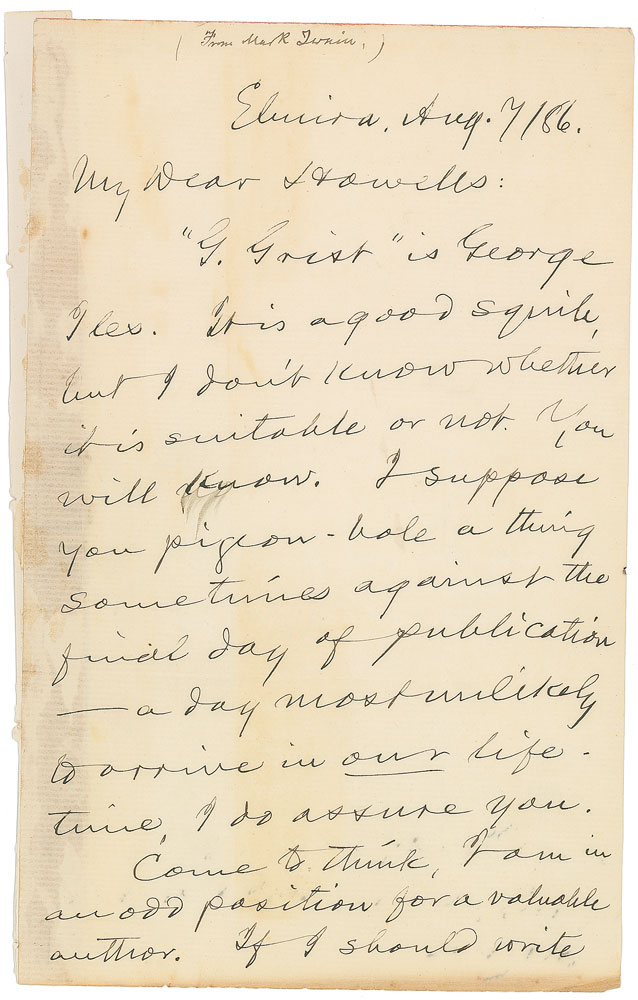 ALS signed “Mark,” two pages, 5.5 x 9, August 7, 1886. Letter to longtime friend and fellow author William Dean Howells, in part: "'G. Grist' is George Iles. It is a good squib, but I don't know whether it is suitable or not. You will know. I suppose you pigeon-hole a thing sometimes against the final day of publication—a day most unlikely to arrive in our life-time, I do assure you. Come to think, I am in an odd position for a valuable author. If I should write a book, I couldn't publish it under ten years, if ever. It wouldn't do to go outside of my own shop-people would say I didn't believe in my own shop. I had a hand-shake with Mrs. Howells?If I had met them an hour earlier I would have gone to Boston for a day. So it was lucky: you'd have lost a day." In very good to fine condition, with light staining from, and show-through from, old mounting remnant strips. Accompanied by a custom-made presentation folder and slipcase, as well as a halftone photo of the authors together. This letter seems to refer to the publication of the book Mark Twain's Library of Humor, an anthology of humorous stories by a wide selection of American authors. Although the project had begun in 1880, the book was not published until 1888. In reality, Clemens did very little work besides lending his name to the title, and Howells served as the anonymous editor.