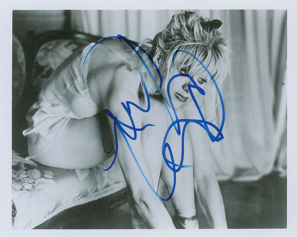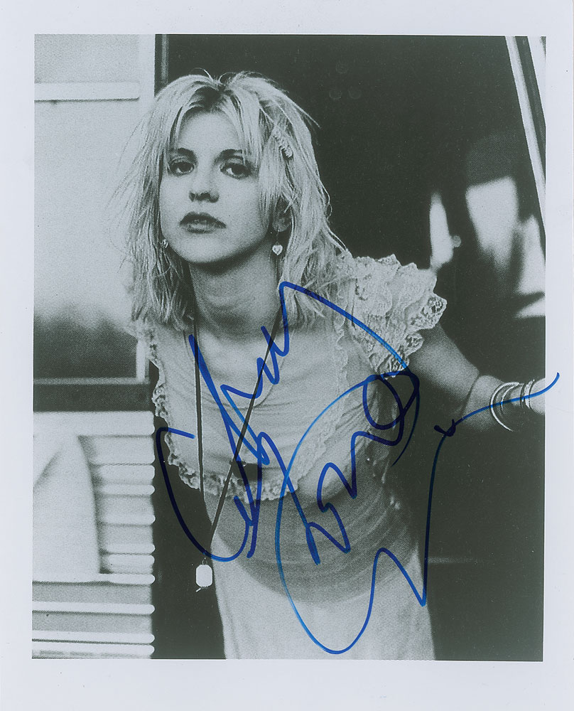 Two glossy photos, 8 x 10 and 10 x 8, showing the Hole front woman wearing an old dress and a night gown, both signed in blue felt tip by Courtney Love. In overall very fine condition. From The John Brennan In-person Autograph Collection.