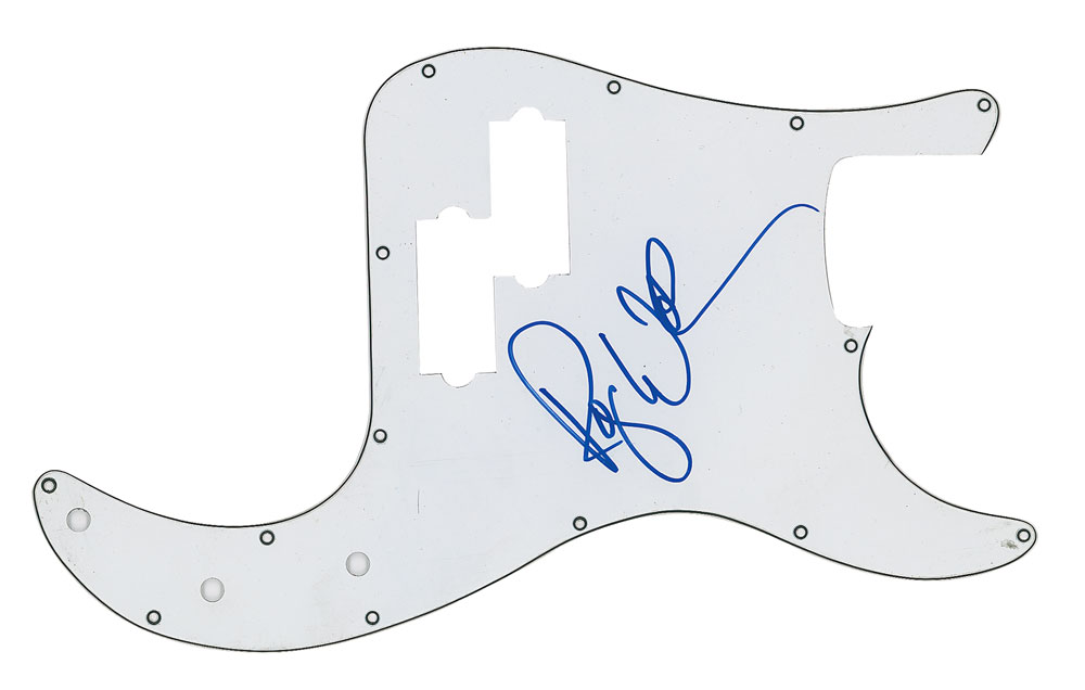 White bass pickguard signed in blue felt tip by Pink Floyd's Roger Waters. In fine condition. From The John Brennan In-person Autograph Collection.