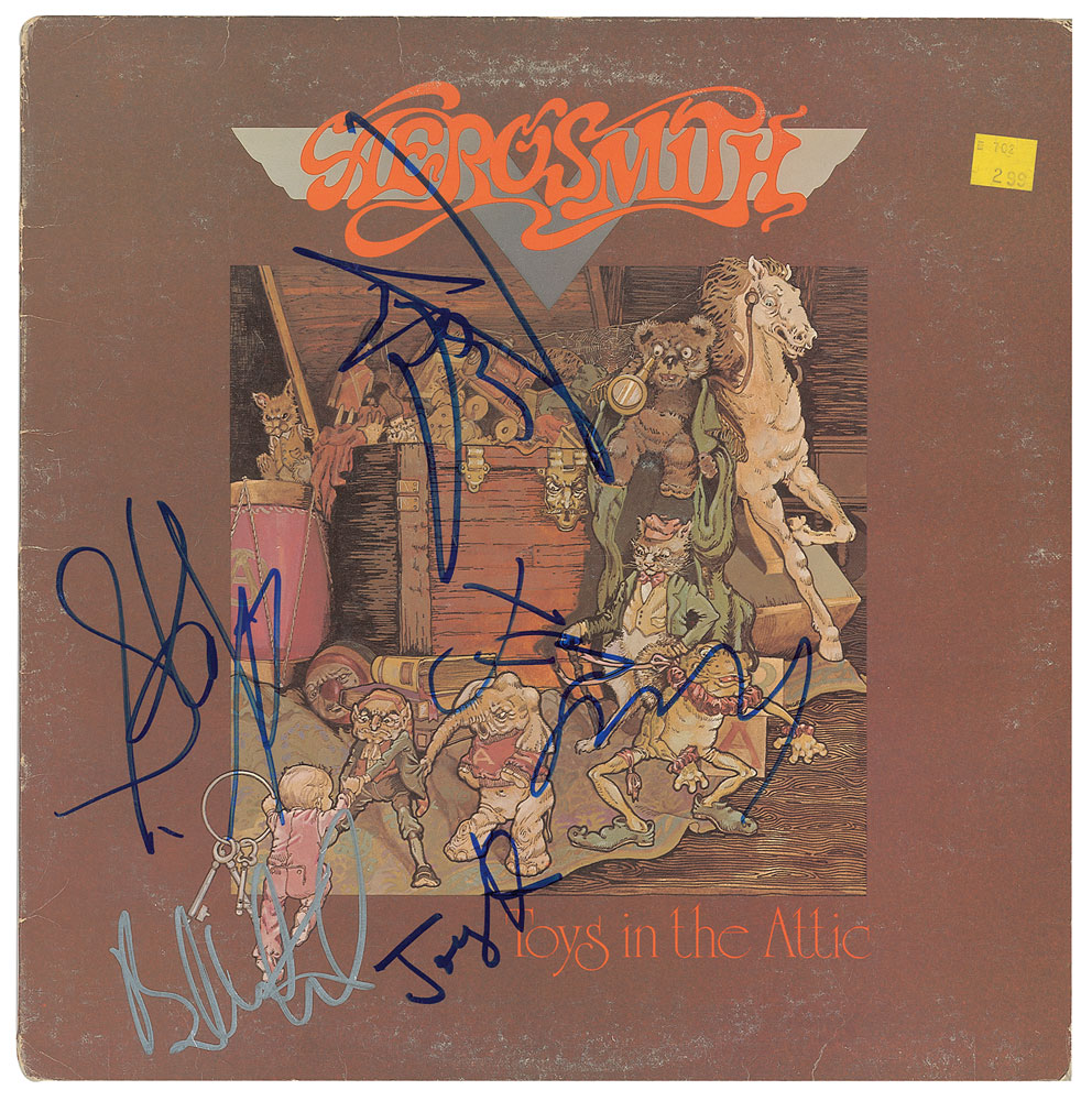 Toys in the Attic album by Aerosmith, signed on the front cover in blue felt tip by Steven Tyler, Joe Perry, Joey Kramer, and Tom Hamilton, and in silver ink by Brad Whitford. In very good to fine condition, with scuffing, and an affixed price sticker. The record is included. From The John Brennan In-person Autograph Collection.