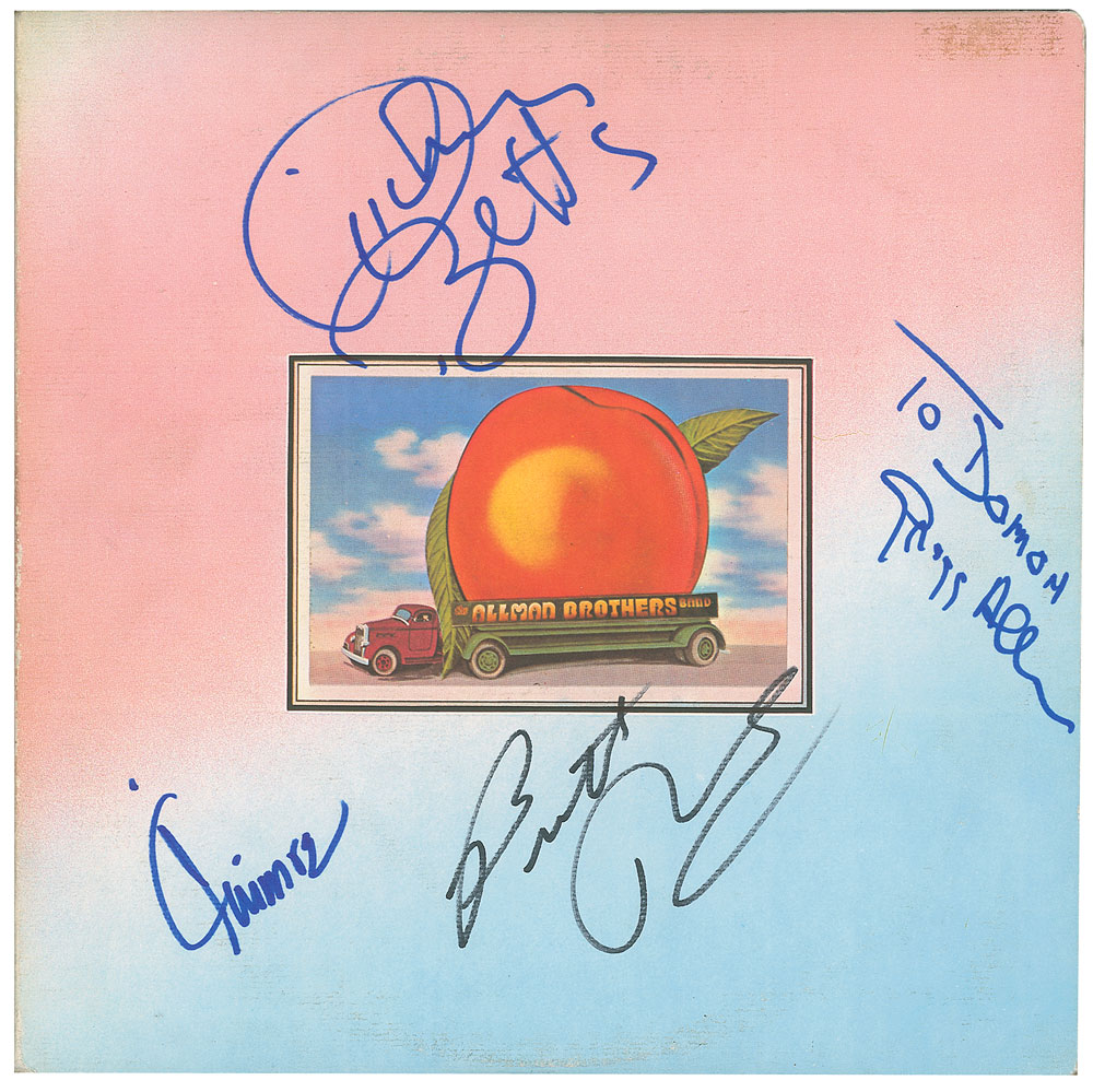 Eat a Peach album by The Allman Brothers Band, signed and inscribed on the front cover in blue felt tip, "To Damon, Gregg Allman," "Dickey Betts," and "Jaimoe," and in black felt tip, "Butch Trucks." In fine condition, with some old sticker residue to the upper right corner. The records are included. From The John Brennan In-person Autograph Collection.