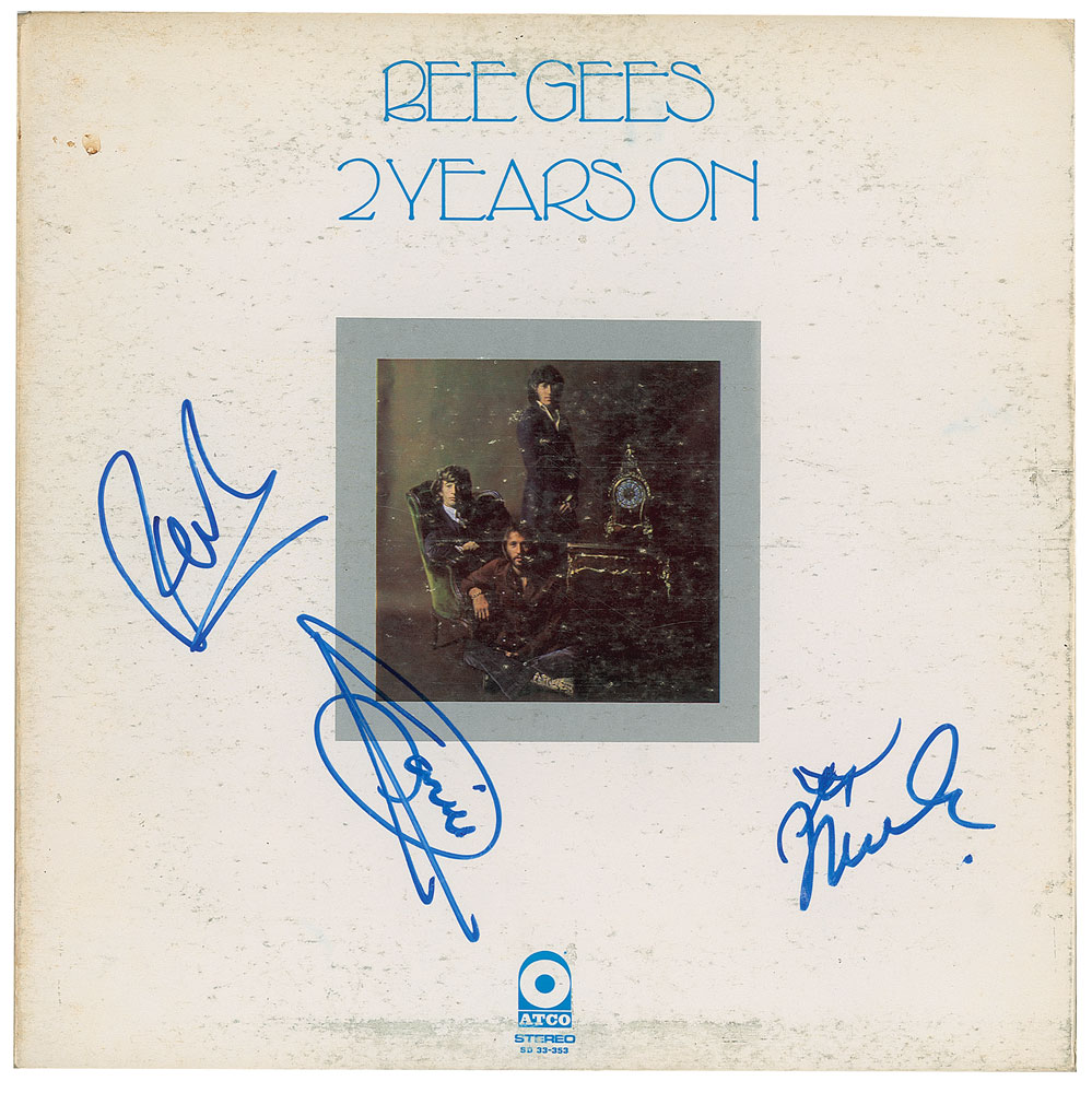 2 Years On album by the Bee Gees, signed on the front cover in blue felt tip by Robin, Barry, and Maurice Gibb. In very good to fine condition, with light overall scuffing. The record is included. From The John Brennan In-person Autograph Collection.