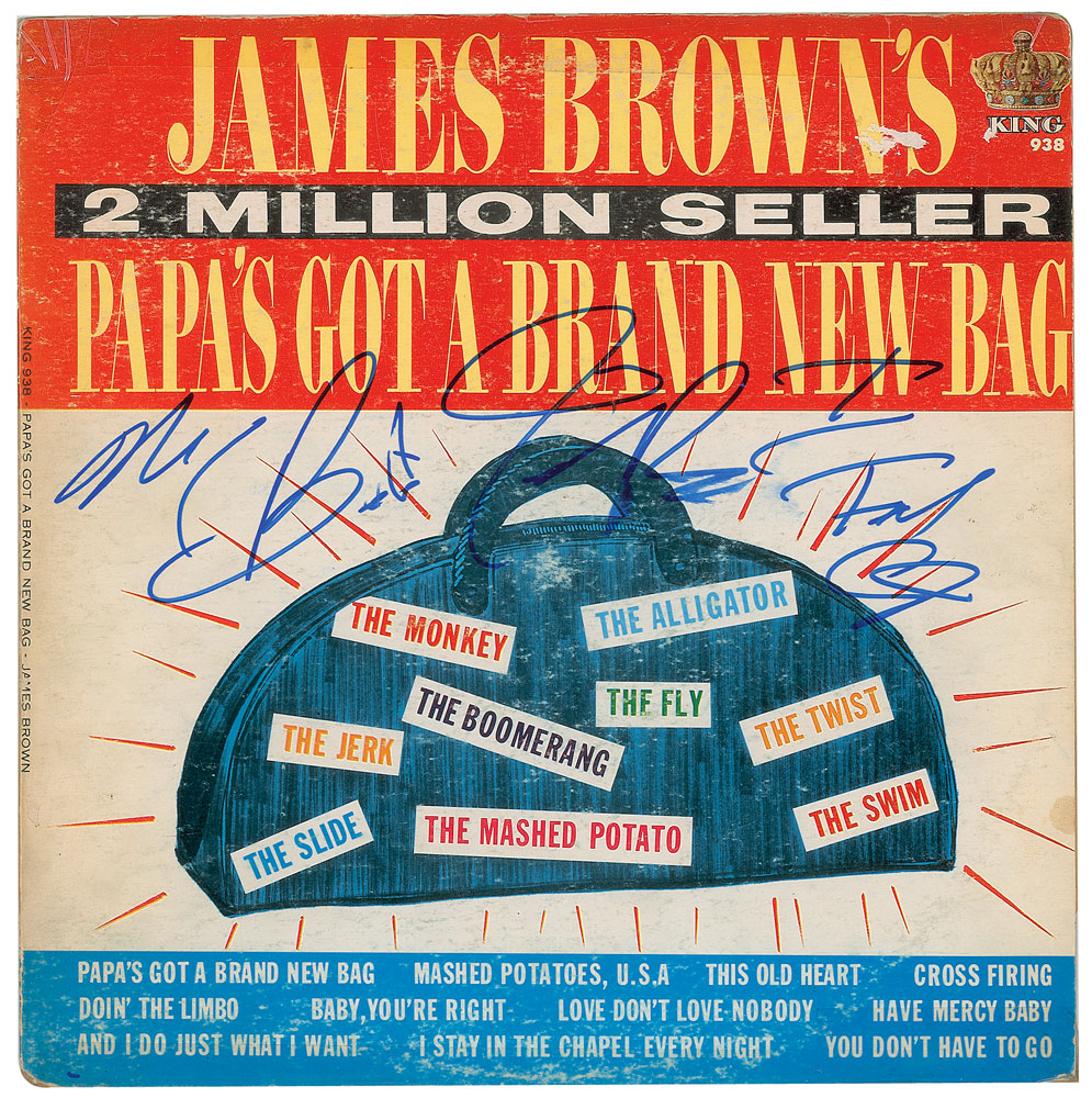 Papa's Got a Brand New Bag album signed on the front cover in blue felt tip, "My Best, James Brown, I Feel Good." In very good condition, with light scuffing, tape to the top and bottom edges, and some surface loss from a removed price sticker. The record is included. From The John Brennan In-person Autograph Collection.