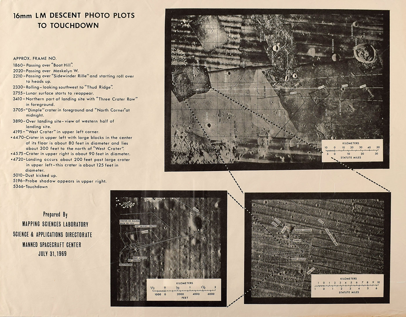 Scarce and visually appealing set of three 22 x 17 Apollo 11 lunar information posters prepared by the Mapping Science Laboratory, Science and Applications Directorate at the Manned Spacecraft Center in late July 1969. These NASA-produced posters were created from 16-mm and 70-mm film from cameras either mounted on the Lunar Module Eagle (Apollo LM-5) or carried by astronauts Neil Armstrong and Buzz Aldrin. The first poster, entitled “16mm LM Descent Photo Plots to Touchdown,” consists of three images: an overall picture of the landing site and approach path of the LM, a magnification of the immediate area of the Apollo 11 landing site, and a magnification of a small area around the landing site, with each image illustrating the terrain that makes up Mare Tranquillitatis. The second poster, headed “Apollo 11 Lunar Surface Panorama from the Surface,” consists of composite images taken from the Eagle, which are entitled "Panorama of the Lunar Surface Looking East" and "Panorama of the Large Crater Approximately 200 Feet East of the LM.” The third poster, headed “Apollo 11 Lunar Surface Panorama Taken from the LM,” again shows composite images from the Eagle, which are entitled "Before EVA" and “After EVA.” Rolled and in overall fine condition.