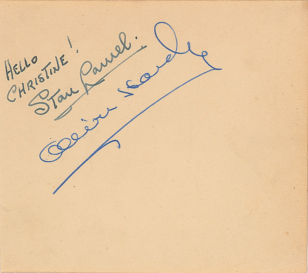 Vintage ink signatures and inscription, "Hello Christine! Stan Laurel" and "Oliver Hardy," on an off-white 4.5 x 4 album page. In fine condition. Consignor notes that these were signed at the Embassy Theatre in Peterborough, UK, in 1952.