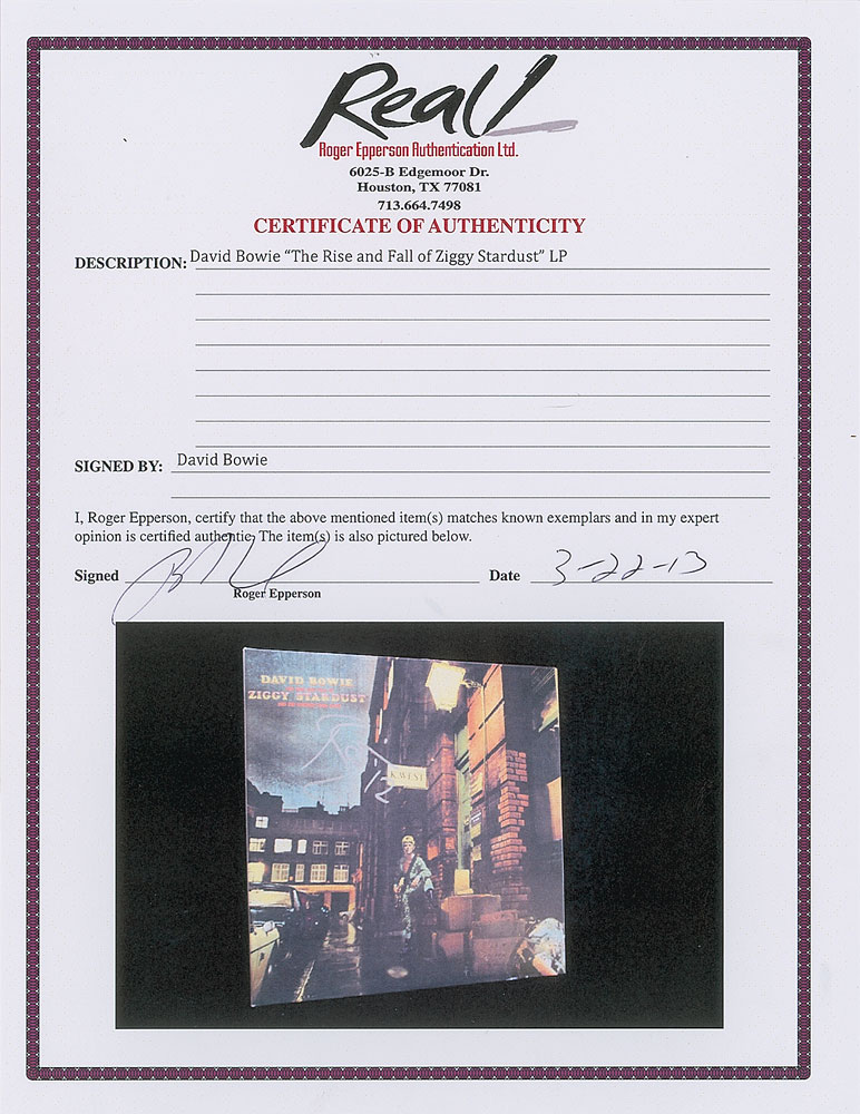 The Rise and Fall of Ziggy Stardust and the Spiders from Mars album by David Bowie, signed on the front cover in silver ink, "Bowie, '12." In fine condition. The record is not included. Considered Bowie's breakthrough album, Ziggy Stardust is widely held to be one of the greatest records of all time. Accompanied by a full letter of authenticity from REAL and a letter of provenance from the original recipient, who notes that the album was signed in New York City in September 2012.