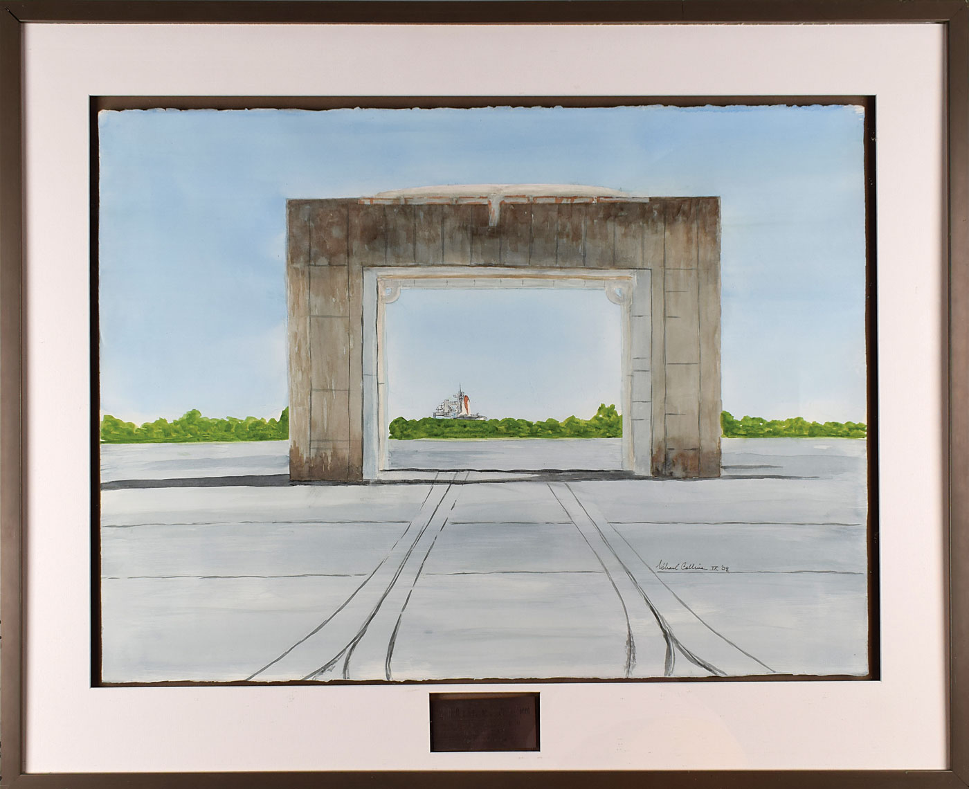 Wonderful original watercolor painting by Apollo astronaut Michael Collins entitled 'Apollo One Bids the Shuttle Godspeed,' 30 x 22.25, which depicts the Space Shuttle in the far distance as viewed through the Apollo 1 launch complex, signed in black ink, "Michael Collins IX '09." Nicely matted and framed to an overall size of 37.75 x 31. In very fine condition. An uncommon space-related original work from the legendary CMP of the first moon-landing mission. Accompanied by a certificate of authenticity from Novaspace.