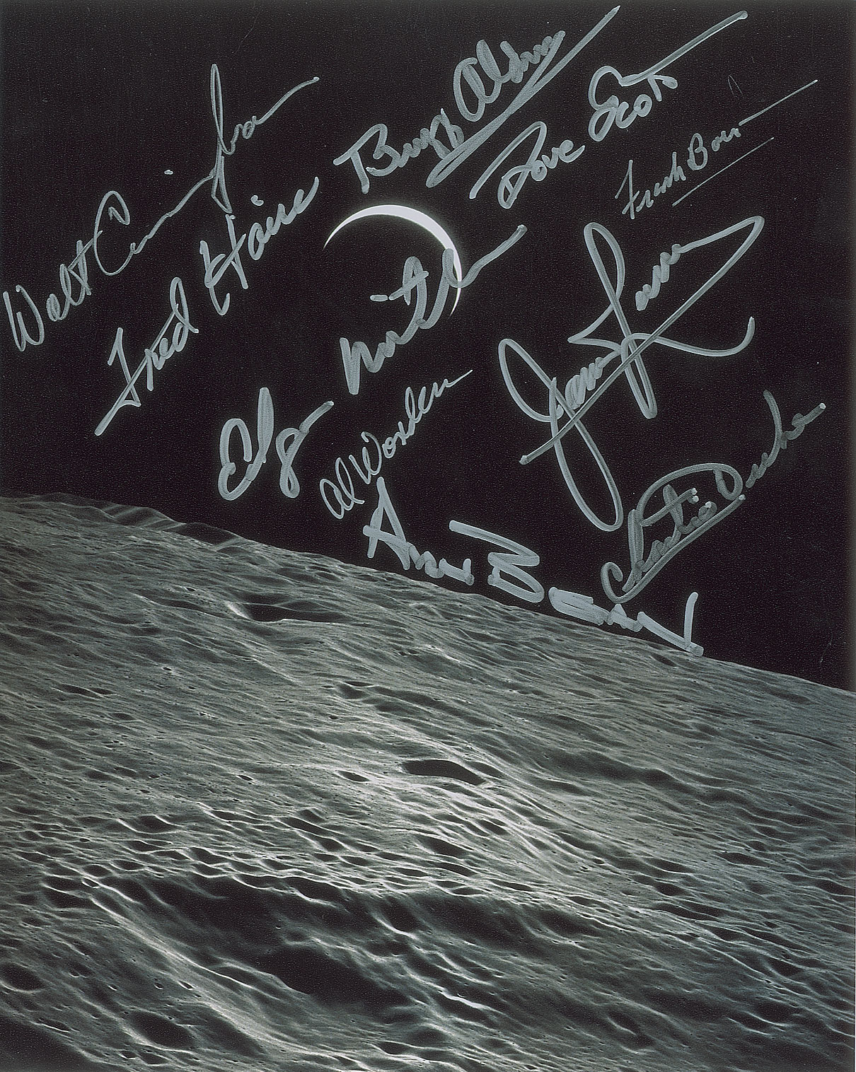 Awesome color satin-finish 8 x 10 photo of the desolate and rolling lunar surface, signed above in silver ink by 10 Apollo astronauts: Buzz Aldrin, Alan Bean, Edgar Mitchell, Dave Scott, Charlie Duke, James Lovell, Frank Borman, Al Worden, Fred Haise, and Walt Cunningham. In very fine condition.