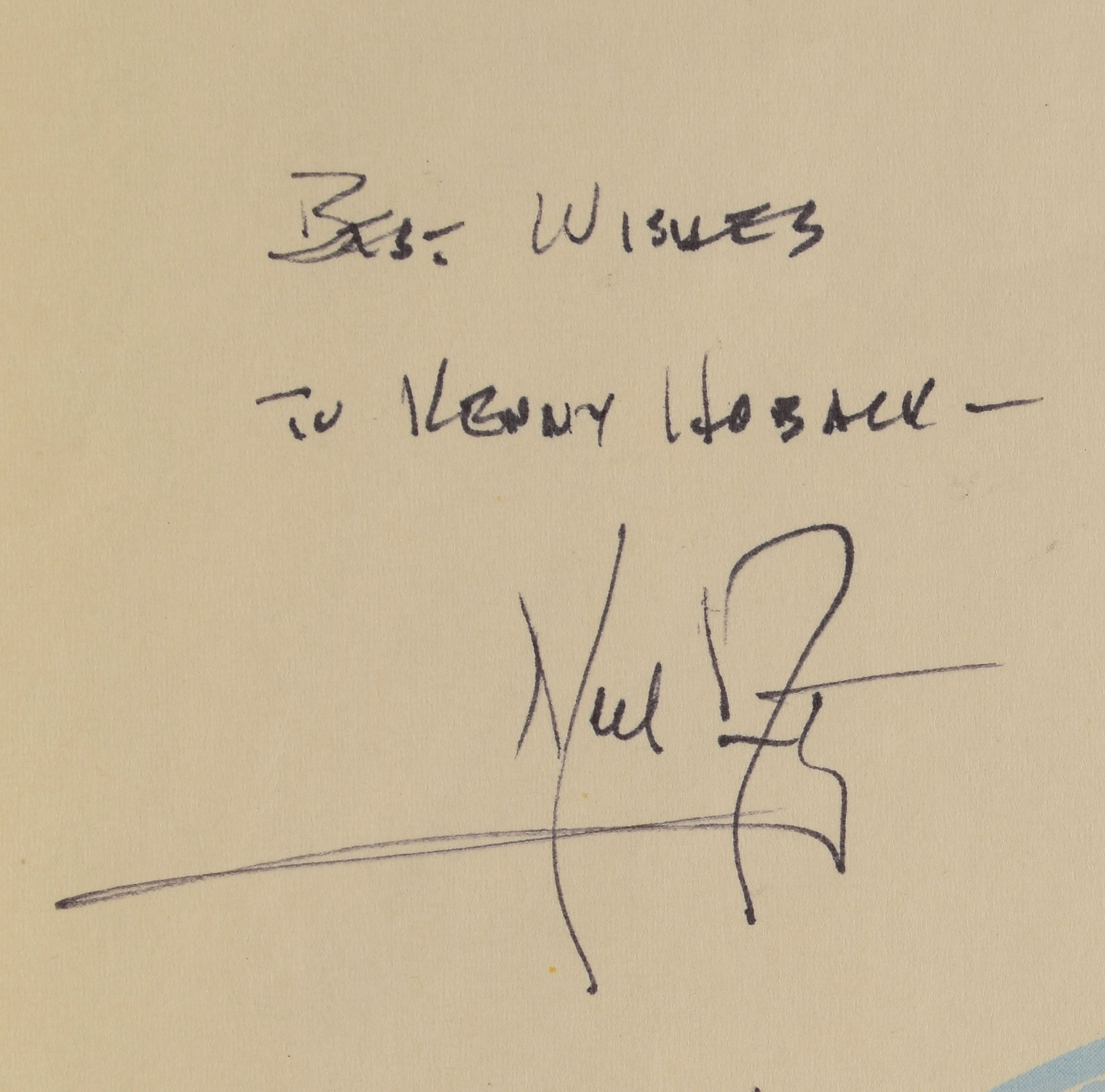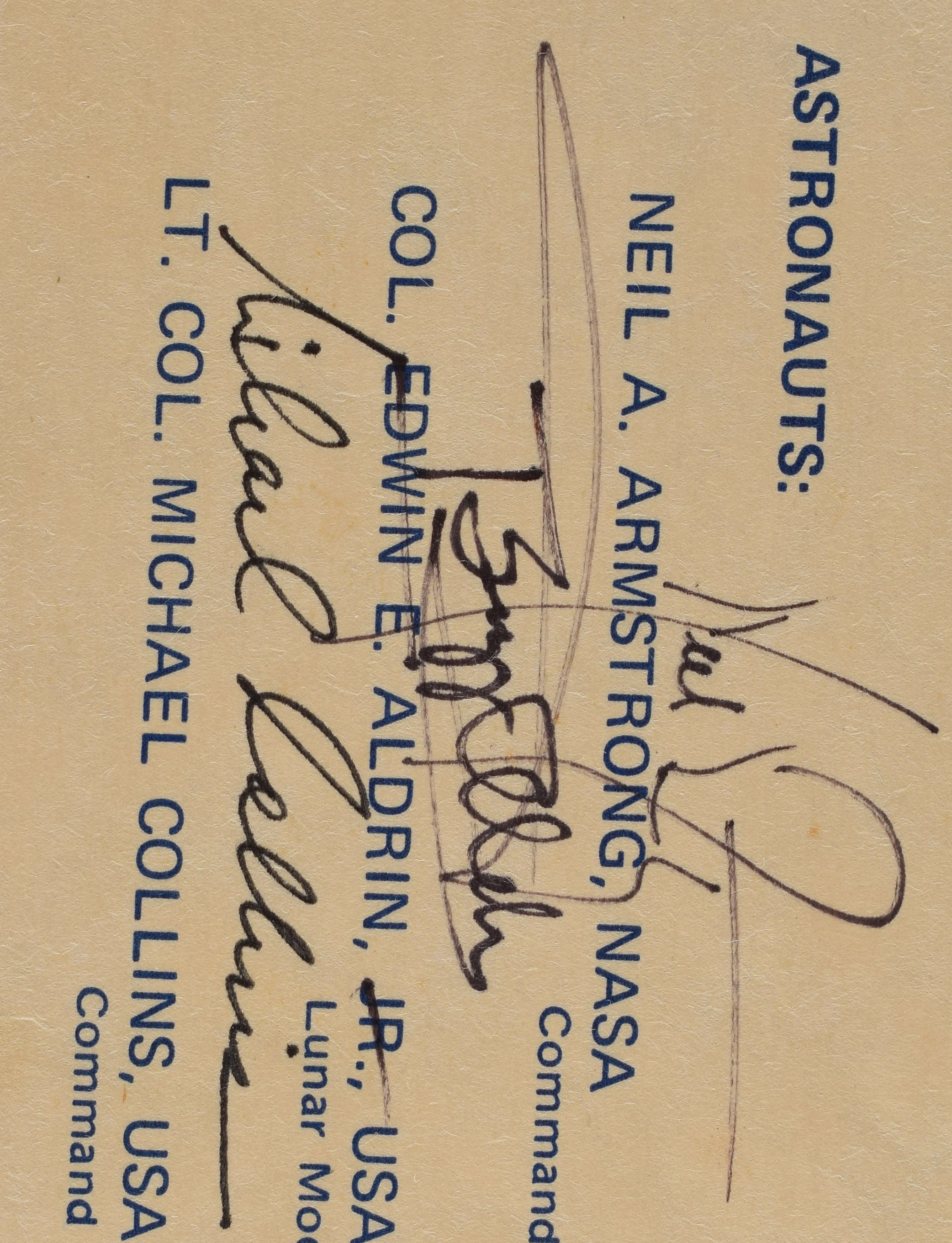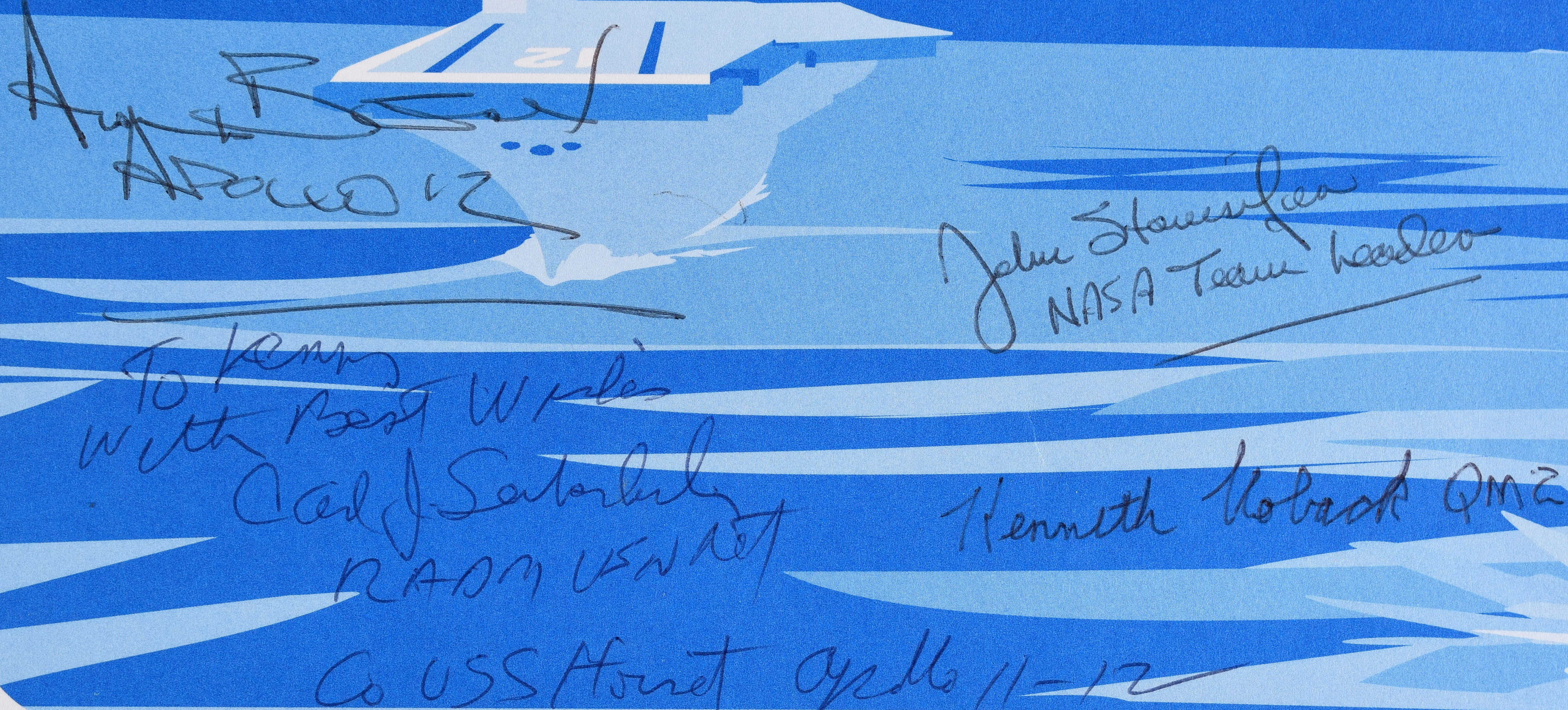 Impressive group lot of four signed items related to the oceanic recovery of the Apollo 11 crew by the Essex-class aircraft carrier USS Hornet, including: a rare Department of Defense certificate, 11 x 8.5, presented to Kenneth H. Hoback, who “served in support of Department of Defense operations during the Apollo XI mission, the first Moon landing flight in July 1969," signed in the lower left corner in black felt tip, "Neil Armstrong," "Buzz Aldrin," and "Michael Collins"; a Helmsman Qualification certificate, 8 x 10.25, presented to Kenneth H. Hoback for having steered the USS Hornet “for a total of 50 hours,” dated October 10, 1968, signed and inscribed in black ink, "Best wishes to Kenny Hoback—Neil Armstrong" and "Buzz Aldrin"; a color glossy 8 x 10 cardstock photo of Armstrong posing in his white space suit against a lunar background, signed and inscribed in black ballpoint, "To Kenny & 'The Hornet,' Neil Armstrong"; and a color 11 x 17 print for the USS Hornet Museum event 'Splashdown! Celebrating the 35th Anniversary of Apollo 11 & 12,” held aboard the USS Hornet between July 16-25, 2004, signed in black ballpoint, “Alan Bean, Apollo 12,” as well as by Hoback, a crew member of the Hornet, and a NASA team leader. In overall fine condition. Hoback was at the helm of the USS Hornet when the time arrived to recover the Apollo 11 astronauts from the Pacific Ocean at sunrise on July 24, 1969. As the quartermaster, Hoback was tasked with steering the Hornet alongside the floating capsule after splashdown, some 900 miles southwest of Hawaii. Accompanied by a letter of commendation to Hoback from his commanding officer, a smaller handbill for the USS Hornet celebration, and two full letters of authenticity from PSA/DNA.