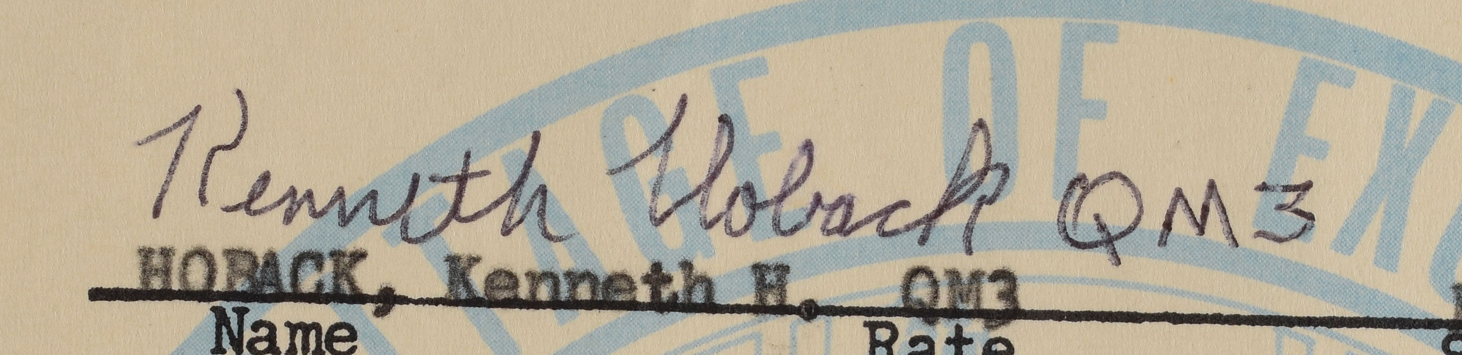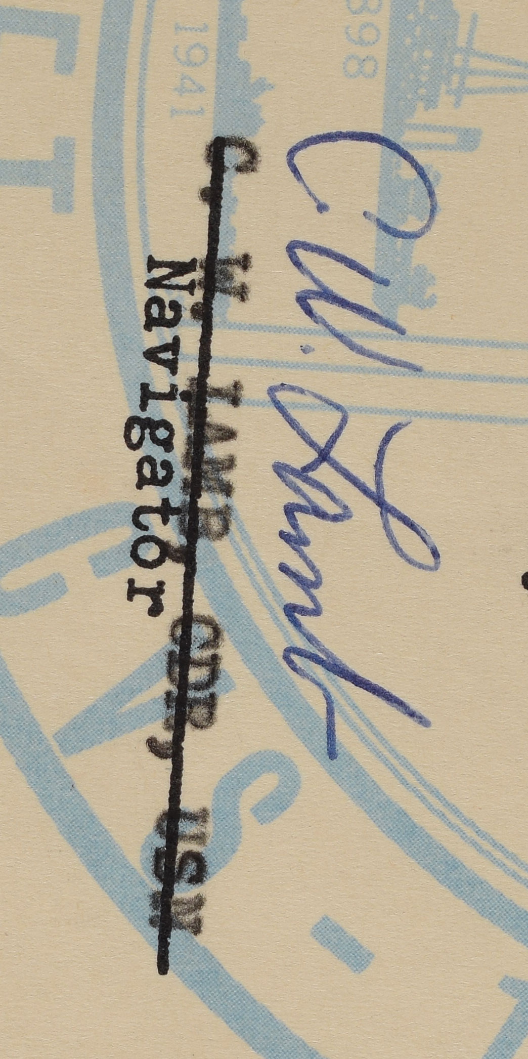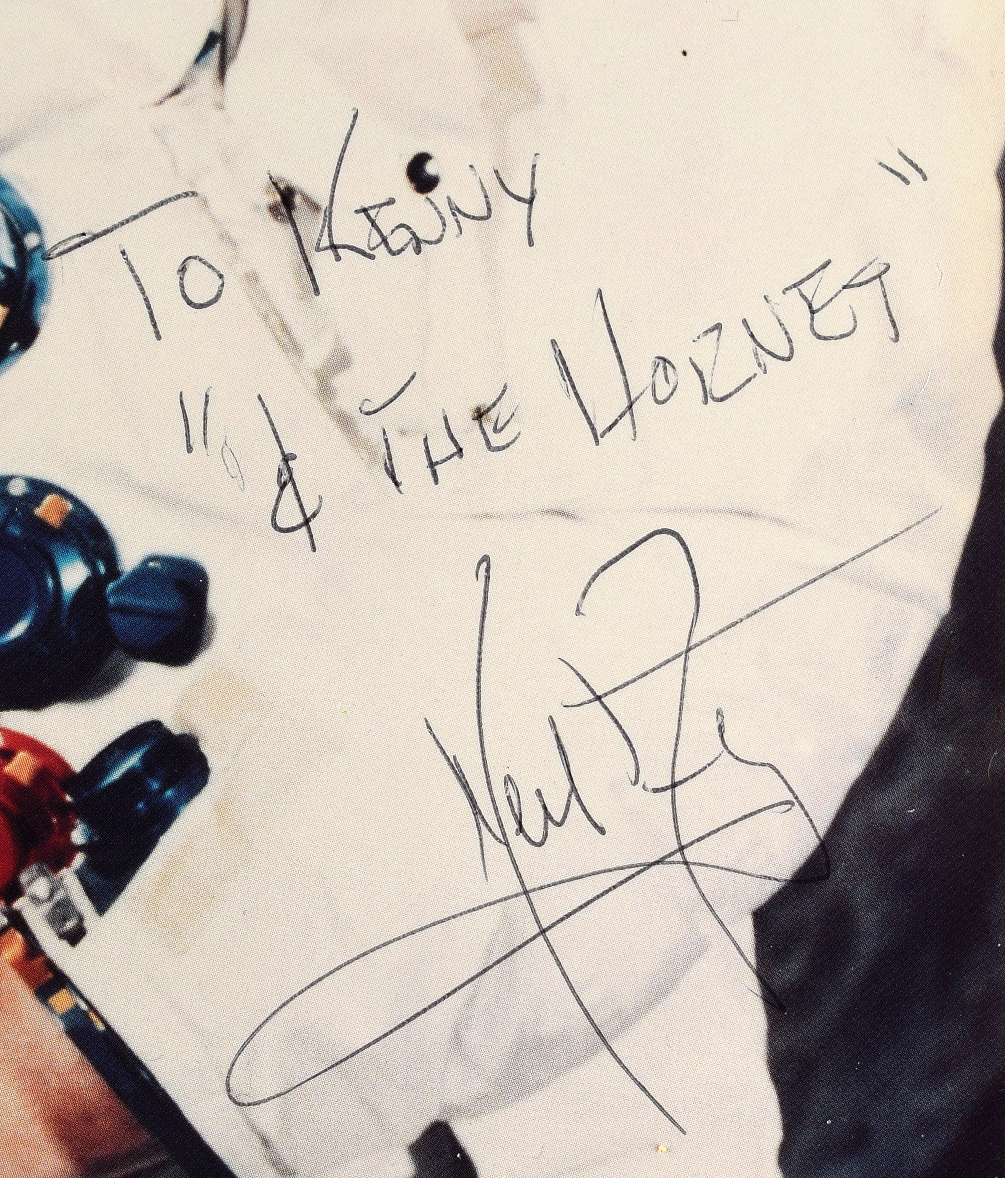 Impressive group lot of four signed items related to the oceanic recovery of the Apollo 11 crew by the Essex-class aircraft carrier USS Hornet, including: a rare Department of Defense certificate, 11 x 8.5, presented to Kenneth H. Hoback, who “served in support of Department of Defense operations during the Apollo XI mission, the first Moon landing flight in July 1969," signed in the lower left corner in black felt tip, "Neil Armstrong," "Buzz Aldrin," and "Michael Collins"; a Helmsman Qualification certificate, 8 x 10.25, presented to Kenneth H. Hoback for having steered the USS Hornet “for a total of 50 hours,” dated October 10, 1968, signed and inscribed in black ink, "Best wishes to Kenny Hoback—Neil Armstrong" and "Buzz Aldrin"; a color glossy 8 x 10 cardstock photo of Armstrong posing in his white space suit against a lunar background, signed and inscribed in black ballpoint, "To Kenny & 'The Hornet,' Neil Armstrong"; and a color 11 x 17 print for the USS Hornet Museum event 'Splashdown! Celebrating the 35th Anniversary of Apollo 11 & 12,” held aboard the USS Hornet between July 16-25, 2004, signed in black ballpoint, “Alan Bean, Apollo 12,” as well as by Hoback, a crew member of the Hornet, and a NASA team leader. In overall fine condition. Hoback was at the helm of the USS Hornet when the time arrived to recover the Apollo 11 astronauts from the Pacific Ocean at sunrise on July 24, 1969. As the quartermaster, Hoback was tasked with steering the Hornet alongside the floating capsule after splashdown, some 900 miles southwest of Hawaii. Accompanied by a letter of commendation to Hoback from his commanding officer, a smaller handbill for the USS Hornet celebration, and two full letters of authenticity from PSA/DNA.