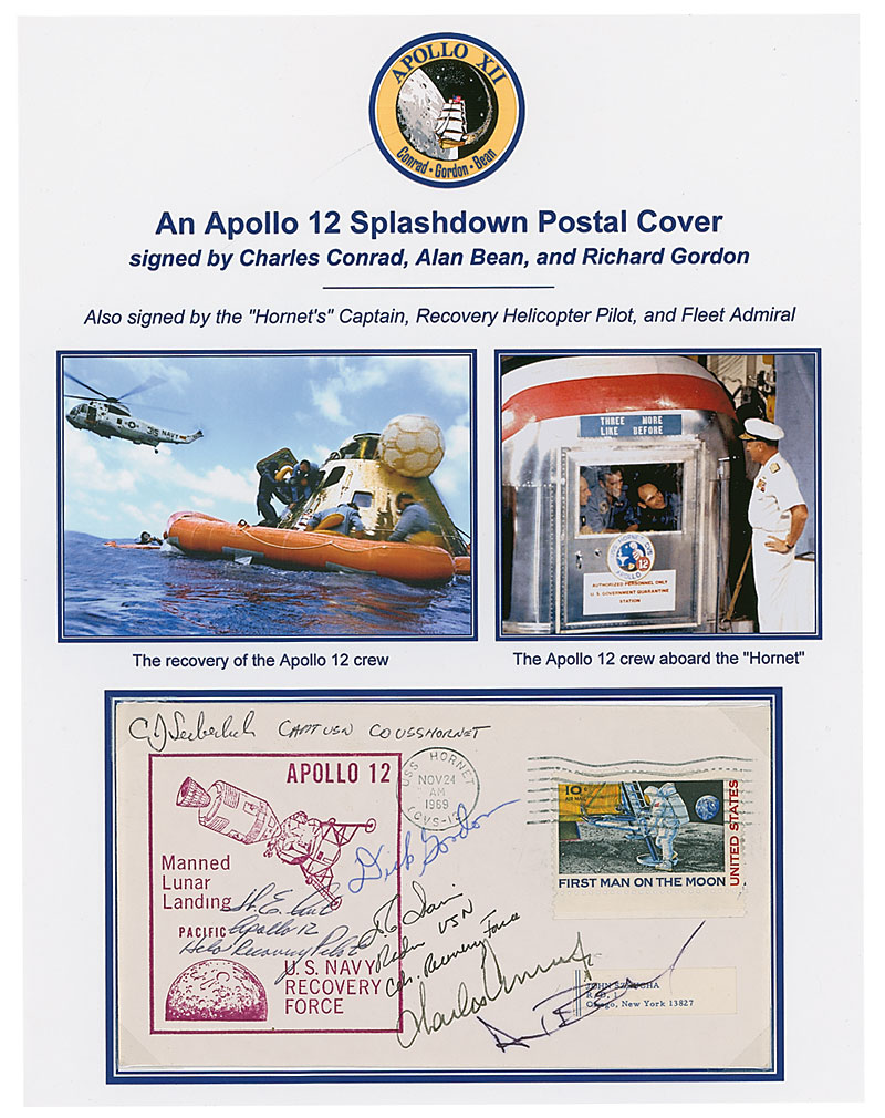 Apollo 12 splashdown cover with a cachet honoring the Pacific U.S. Navy Recovery Force for the Apollo 12 mission, postmarked aboard the USS Hornet on November 24, 1969, signed in ink or ballpoint by Charles Conrad, Alan Bean, and Richard Gordon. Also signed by USS Hornet Captain Captain Carl Seiberlich, and two recovery personnel. Removably corner-mounted to a color 8.5 x 11 presentation sheet. In fine condition.