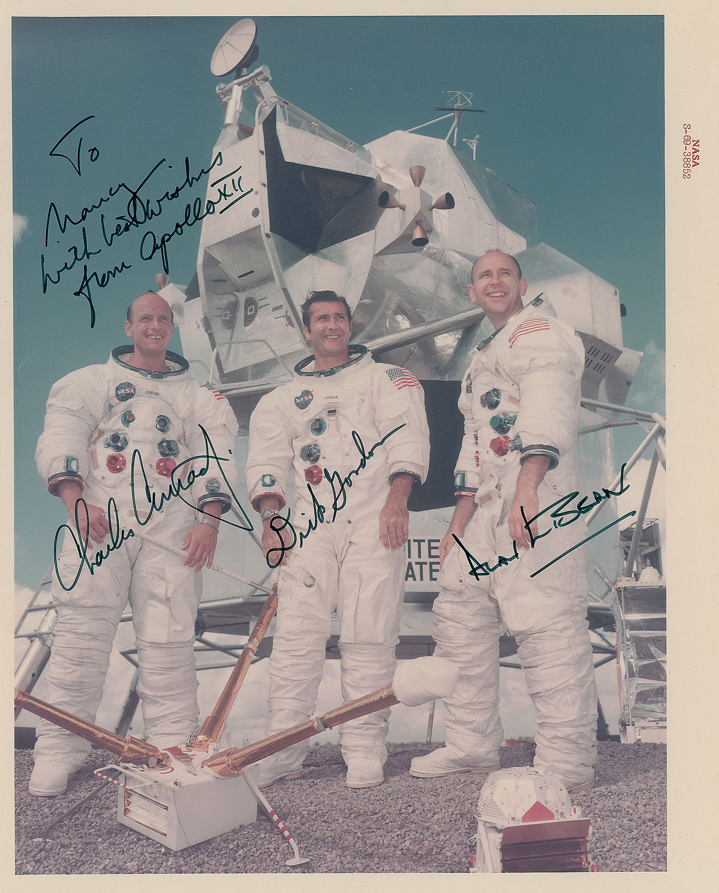 Official color glossy 8 x 10 red-numbered NASA photo of the Apollo 12 crew posing in front of the lunar module, signed and inscribed in black felt tip, "To Nancy, with best wishes from Apollo XII, Charles Conrad, Jr.," "Dick Gordon," and "Alan L. Bean." Reverse bears "A Kodak Paper" watermarks. In fine condition, with a light paperclip impression to the top edge, and a light crease above Gordon's head.