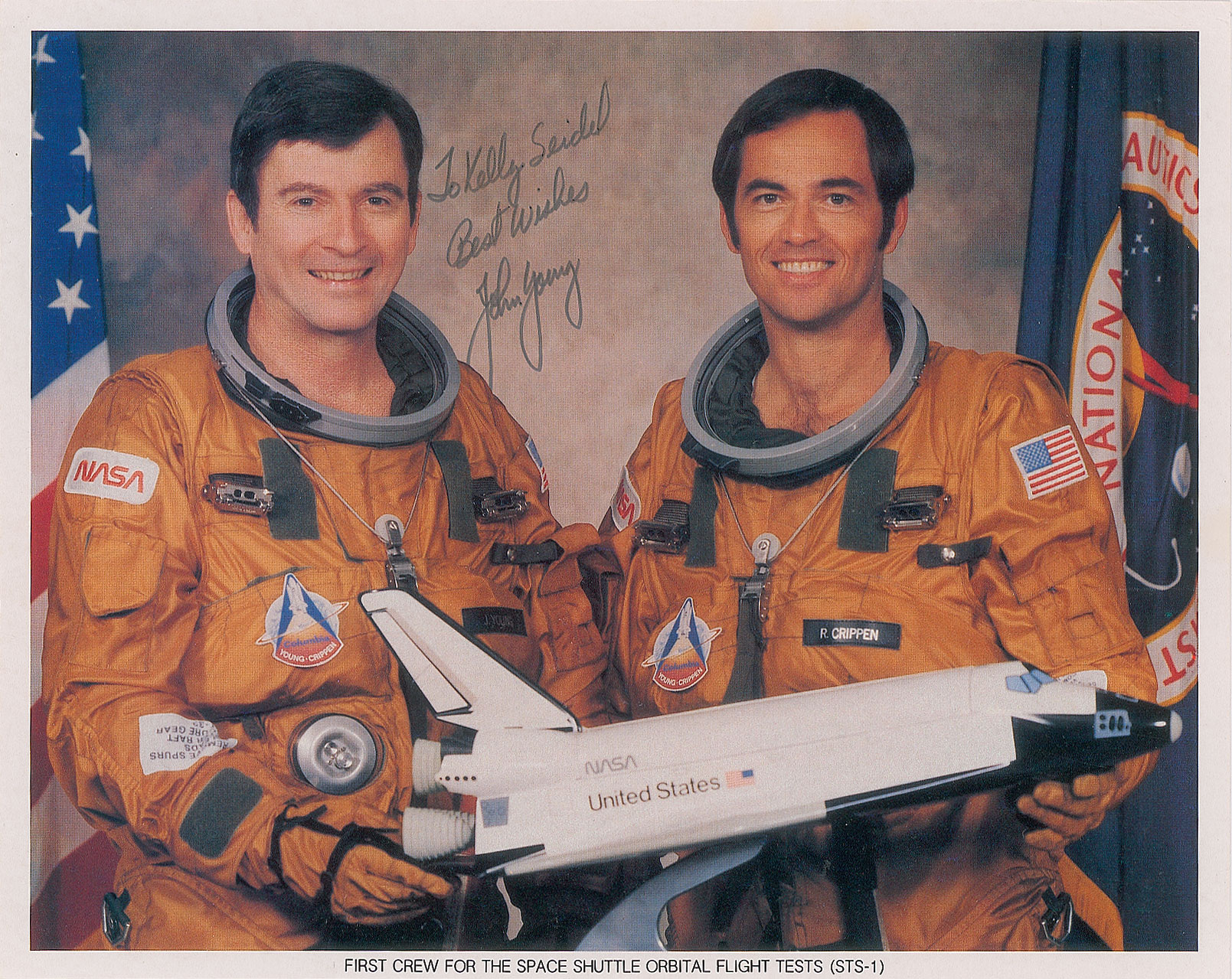 Official color 10 x 8 NASA lithograph of the STS-1 crew posing in their orange flight suits with a model of the Space Shuttle Columbia, signed and inscribed in black felt tip, "To Kelly Seidel, Best wishes, John Young.” In fine condition.