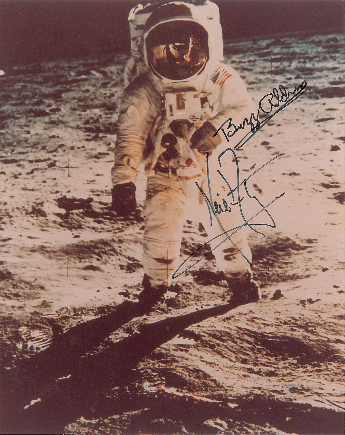Very desirable color satin-finish 8 x 10 photo of Lunar Module Pilot Buzz Aldrin at Tranquility Base during the Apollo 11 mission, his visor showing a small reflection of the photographer, Commander Neil Armstrong, signed in black felt tip by both moonwalkers. Reverse bears "This Paper Manufactured by Kodak" watermarks. In fine condition. Accompanied by a certificate of authenticity from Astronaut Central for the Aldrin signature. A sought-after uninscribed example of this classic lunar pose.