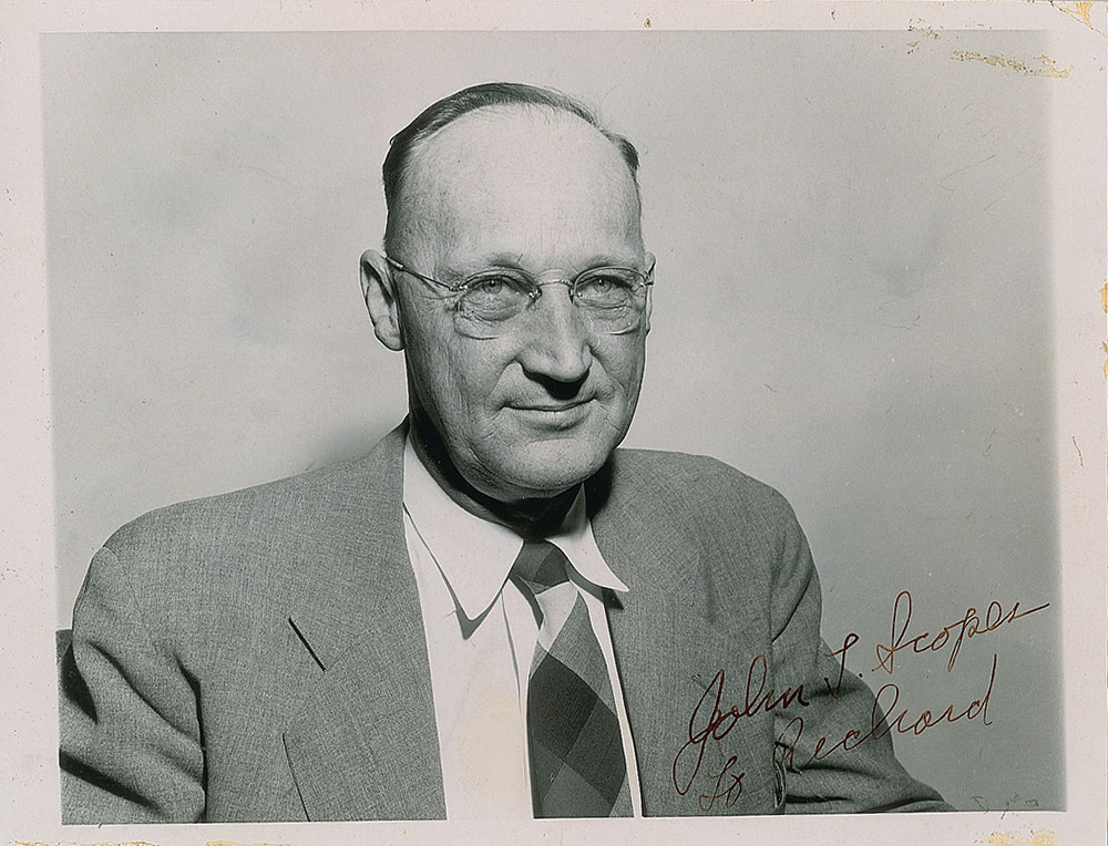 American educator (1900-1970) who defied state law in Tennessee by teaching the theory of evolution, precipitating the famous 'Monkey Trial' trial in 1925. He was convicted and received a nominal fine, but the decision was ultimately reversed on a technicality. Sharp glossy 9 x 7 photo of the scholarly Scopes in a suit and tie, signed and inscribed in fountain pen, "John T. Scopes, to Richard.” Affixed to a same-size sheet and in fine condition, with a few light stains. Scopes is scarce in signed photographs.