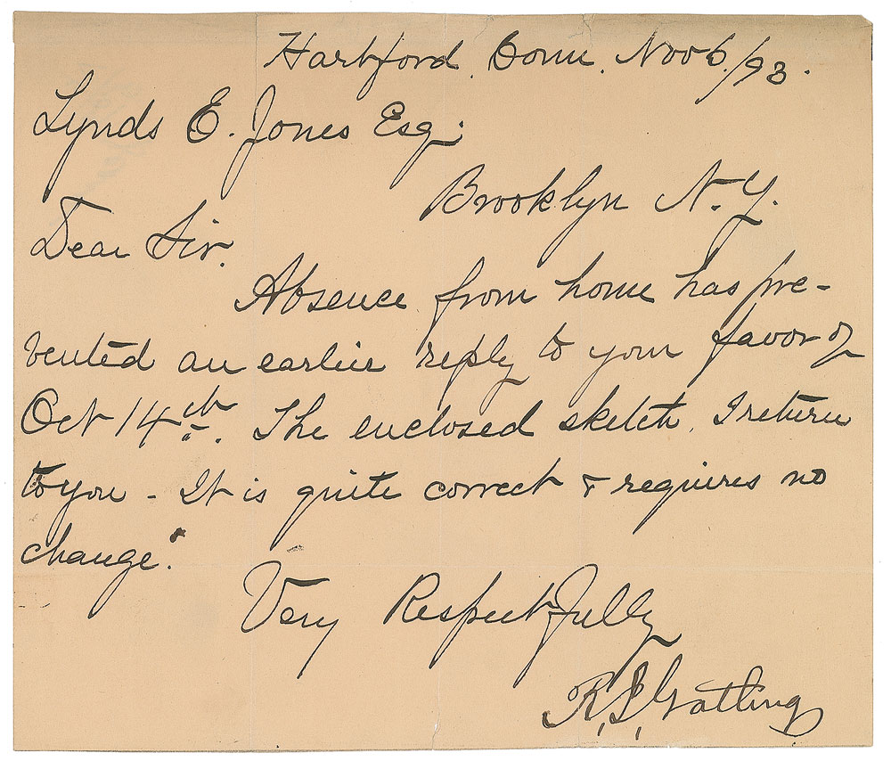 American inventor (1818-1903) best known for his invention of the Gatling gun, considered to be the first successful machine gun; his other inventions include a screw propeller and a wheat drill, a hemp break machine, a steam plow, a marine steam ram, and a motor-driven plow. ALS signed "R. J. Gatling," one page, 7.75 x 5.75, November 6, 1898. Letter to Lynds. E. Jones, in full: "Absence from home has prevented an earlier reply to your favor of Oct. 14th. The enclosed sketch I return to you. It is quite correct and requires no change." In fine condition, with trimmed edges and a strip of tape to top edge of reverse.
