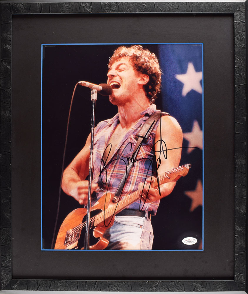 Color glossy 10.75 x 13.75 photo of Bruce Springsteen singing and playing guitar during an intense live performance, signed prominently in black felt tip. Matted and framed to an overall size of 17 x 20. In fine condition, with a JSA label affixed to lower right corner. Accompanied by full letters of authenticity from JSA and REAL.