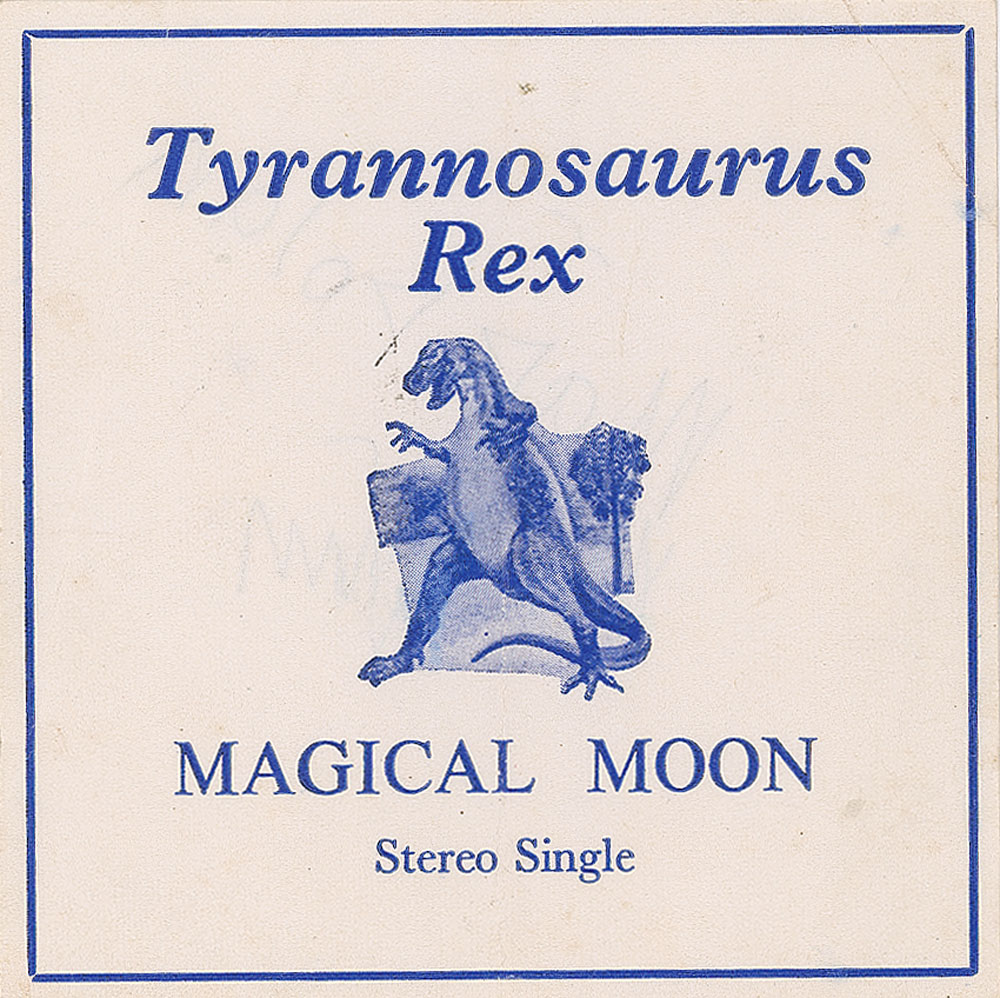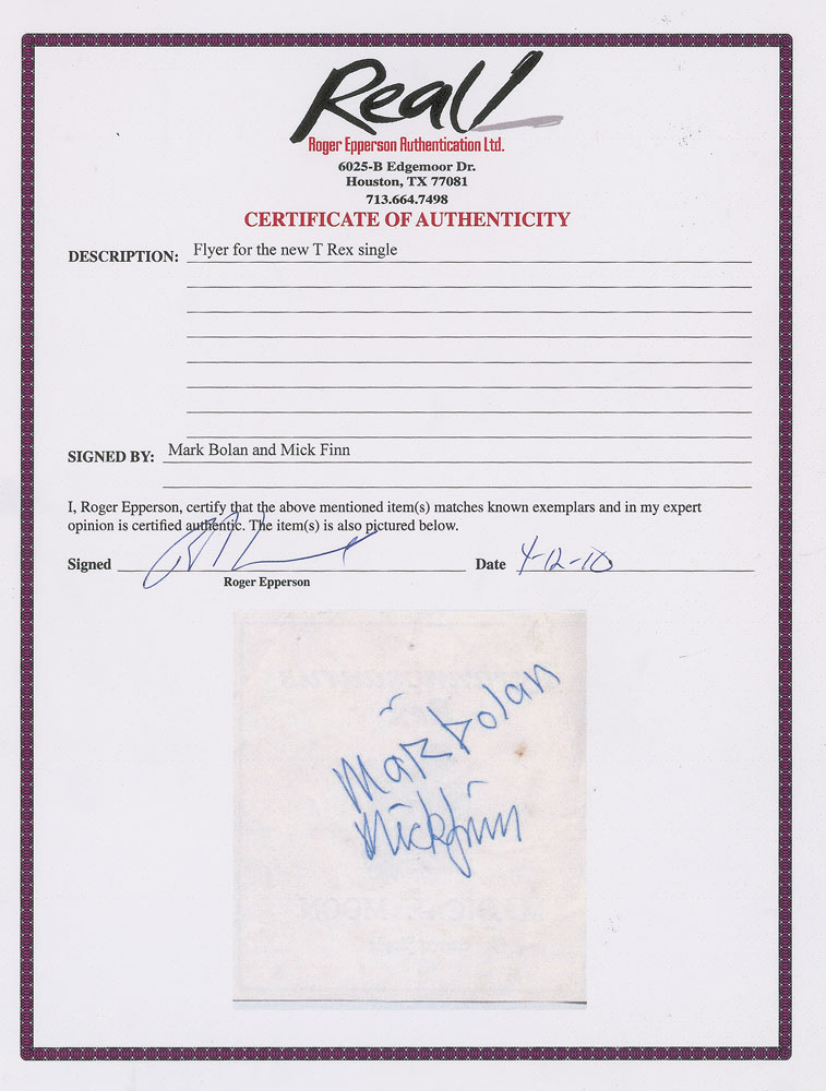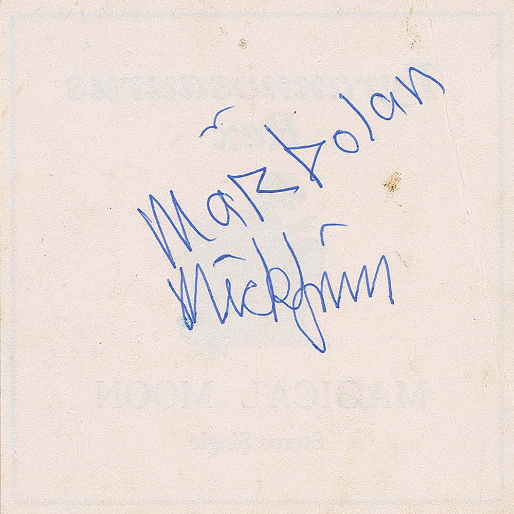 Ballpoint signatures of Marc Bolan and Mickey Finn on the reverse of a 3.5 x 3.5 flyer for the Tyrannosaurus Rex single 'Magical Moon.' In very good to fine condition, with light creasing and a heavier diagonal fold. Accompanied by a full letter of authenticity from REAL.