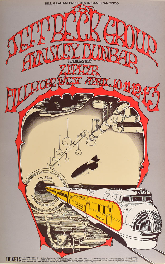 Original color 13 x 21.25 Bill Graham Presents concert poster for a series of four shows featuring The Jeff Beck Group, Aynsley Dunbar Retaliation, and Zephyr at the Fillmore West on April 10-13, 1969 (BG168-PO), with Randy Tuten artwork showing a passenger train express, industrial ductwork, and a nose-diving blimp. Printed by Tea Lautrec Litho of San Francisco. In fine condition.