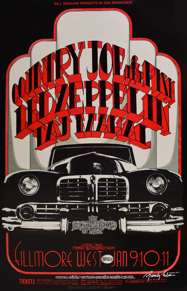 Original color 14 x 21.5 Bill Graham Presents concert poster for a series of three shows featuring Country Joe & the Fish, Led Zeppelin, and Taj Mahal at the Fillmore West on January 9-11, 1969 (BG155-PO), with artwork and design by D. Bread, Peter Pynchon, and Randy Tuten, who signs below in silver ink. Printed by Tea Lautrec Litho of San Francisco. In fine condition.