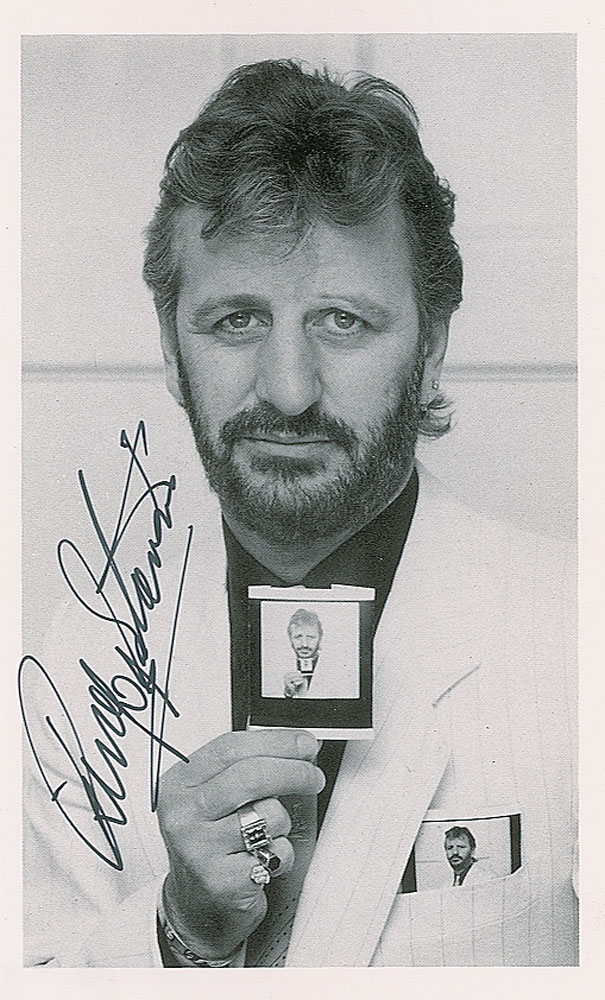 Semi-glossy 3.5 x 5.5 photo of Ringo Starr holding a photo of himself holding a photo, with a second photo peeking out from his front pocket, signed in black felt tip. In very fine condition. Accompanied by the original mailing envelope and by a certificate of authenticity from Tracks.