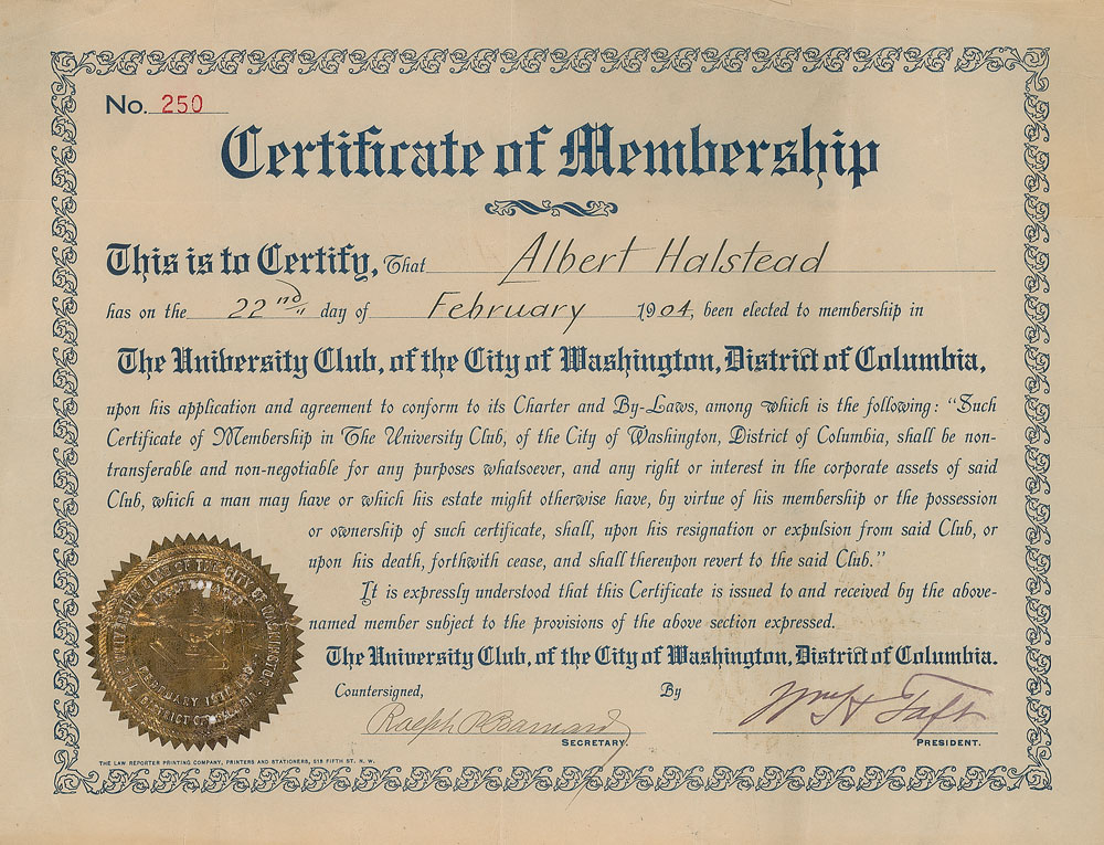 Partly-printed DS, signed “Wm. H. Taft,” one page, 11 x 8.5, February 22, 1904. Certificate of membership in the University Club of Washington, D.C., awarded to Albert Halstead, signed at the conclusion by Taft as the club's president. An embossed foil seal is affixed to the lower left. In very good condition, with intersecting folds, overall creasing, and a tear to the gold foil seal.