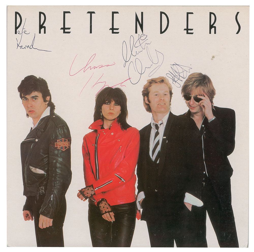 Self-titled debut album by The Pretenders, signed on the front cover in red ballpoint by Chrissie Hynde, and in black ballpoint by Martin Chambers, Pete Farndon, and James Honeyman-Scott. In fine condition, with a small bit of surface loss, and some sticker residue, from where a sticker was removed in the upper right background area. The record is not included.