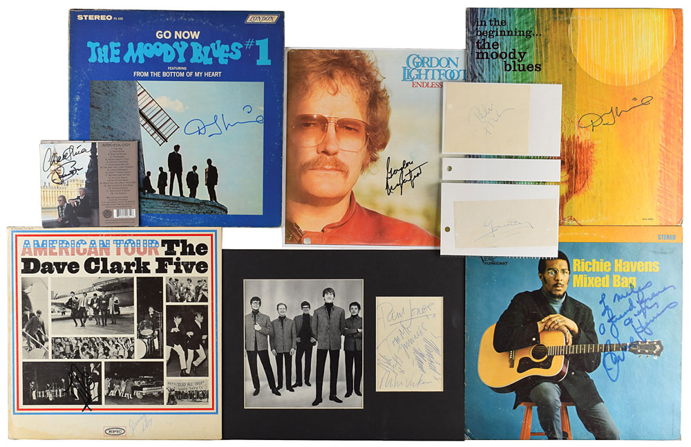 Group of nine items signed by popular musicians, including: a color cardstock 10.75 x 11.5 photo of Gordon Lightfoot's Endless Wire album cover, signed in black felt tip by Lightfoot; an Ark-eology CD, signed on the back cover in black felt tip by Chad Stuart and Jeremy Clyde; American Tour album by The Dave Clark Five, signed in black felt tip by Mike Smith; two Moody Blues albums, each signed in blue felt tip by Denny Laine; Mixed Bag album signed and inscribed in blue felt tip by Richie Havens; vintage ballpoint signatures of Manfred Mann, Paul Jones, Tom McGuinness, Mike Hugg, and Mike Vickers on an off-white 3.75 x 5.25 album page, matted with an image of the band to an overall size of 14 x 11; and vintage ballpoint signatures of Peter Asher and Gordon Waller on individual off-white slips. In overall very good to fine condition.