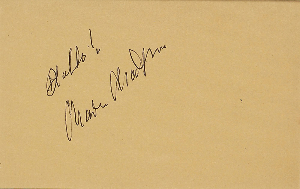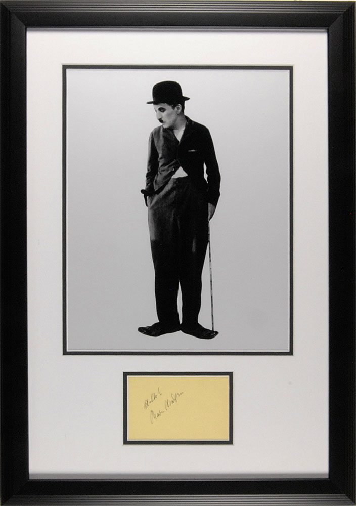 Crisp ballpoint signature, "Hello! Charlie Chaplin," on a yellow album page. Double-matted and framed with a splendid 11 x 14 portrait of Chaplin as the 'Little Tramp' to an overall size of 17 x 24. In fine condition.